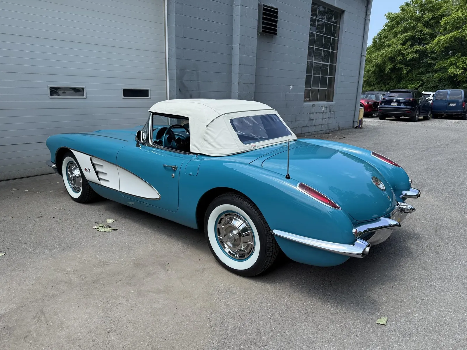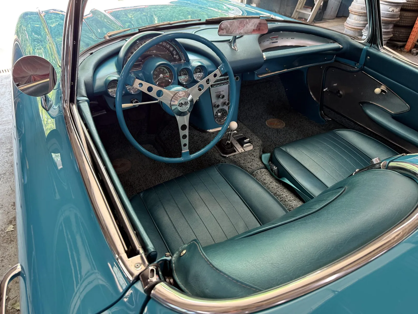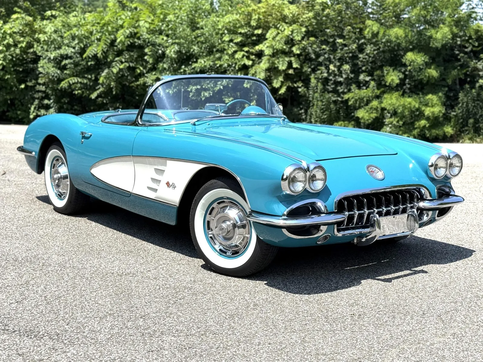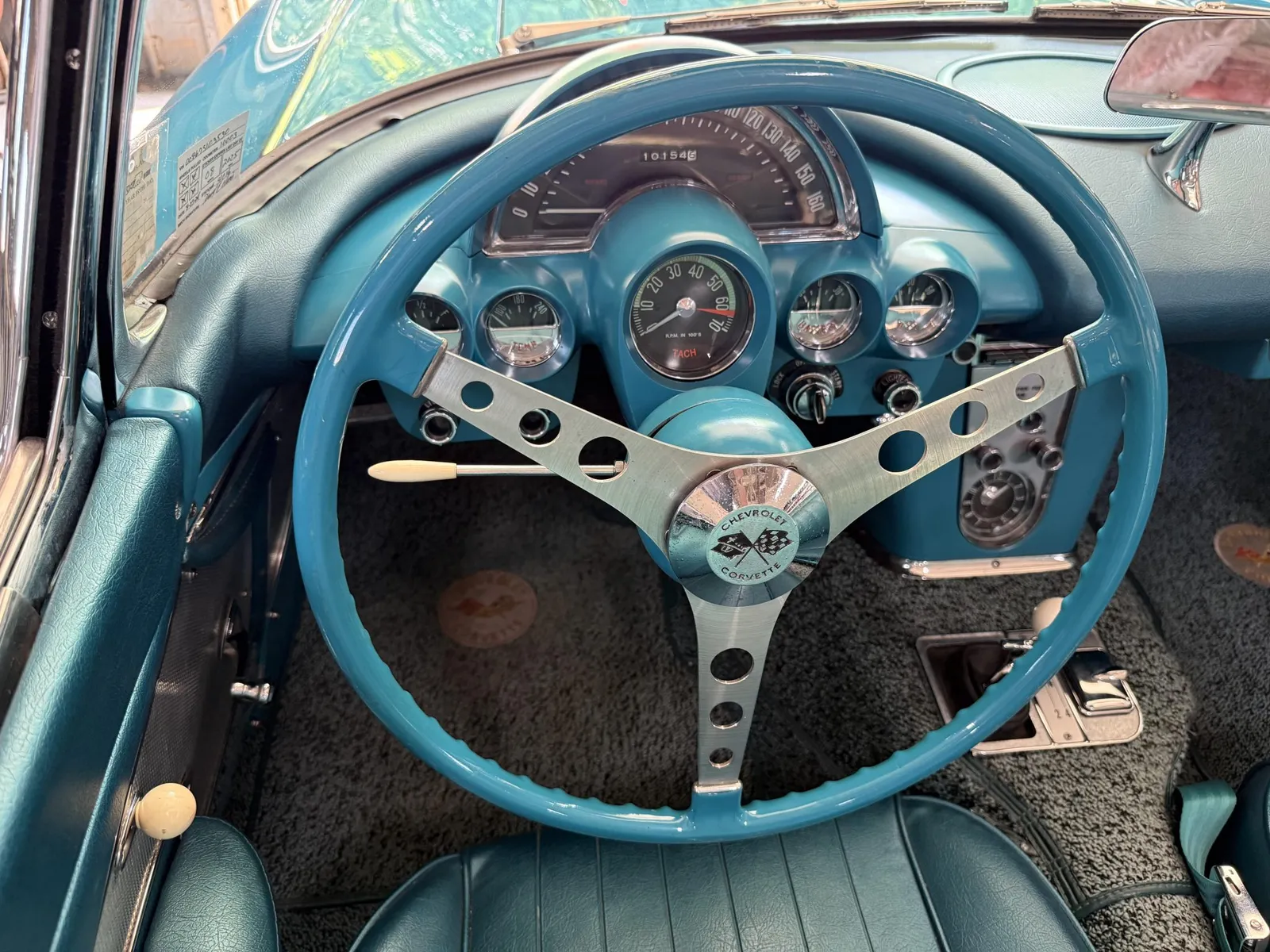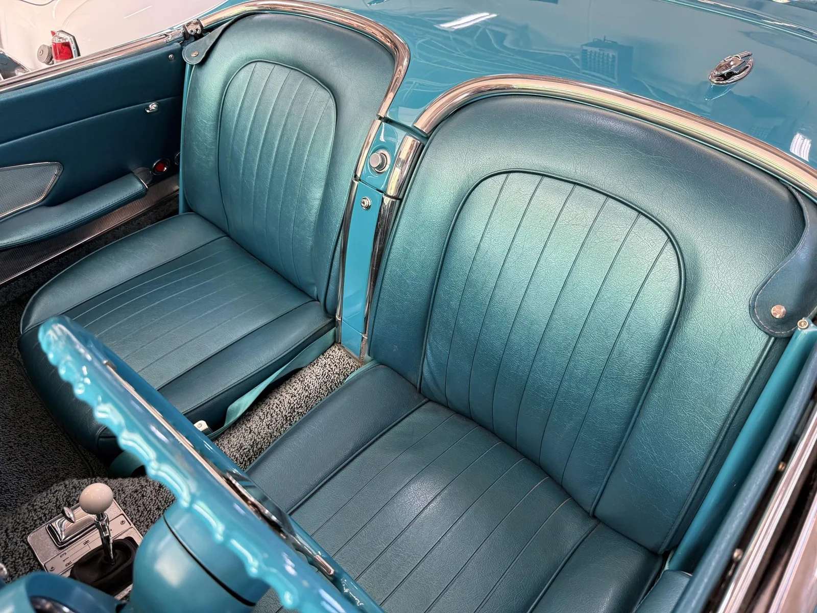 Chevrolet Corvette finished in turquoise over turquoise vinyl with a white convertible soft top, powered by a 283ci V8 and a four-speed manual transmission.
