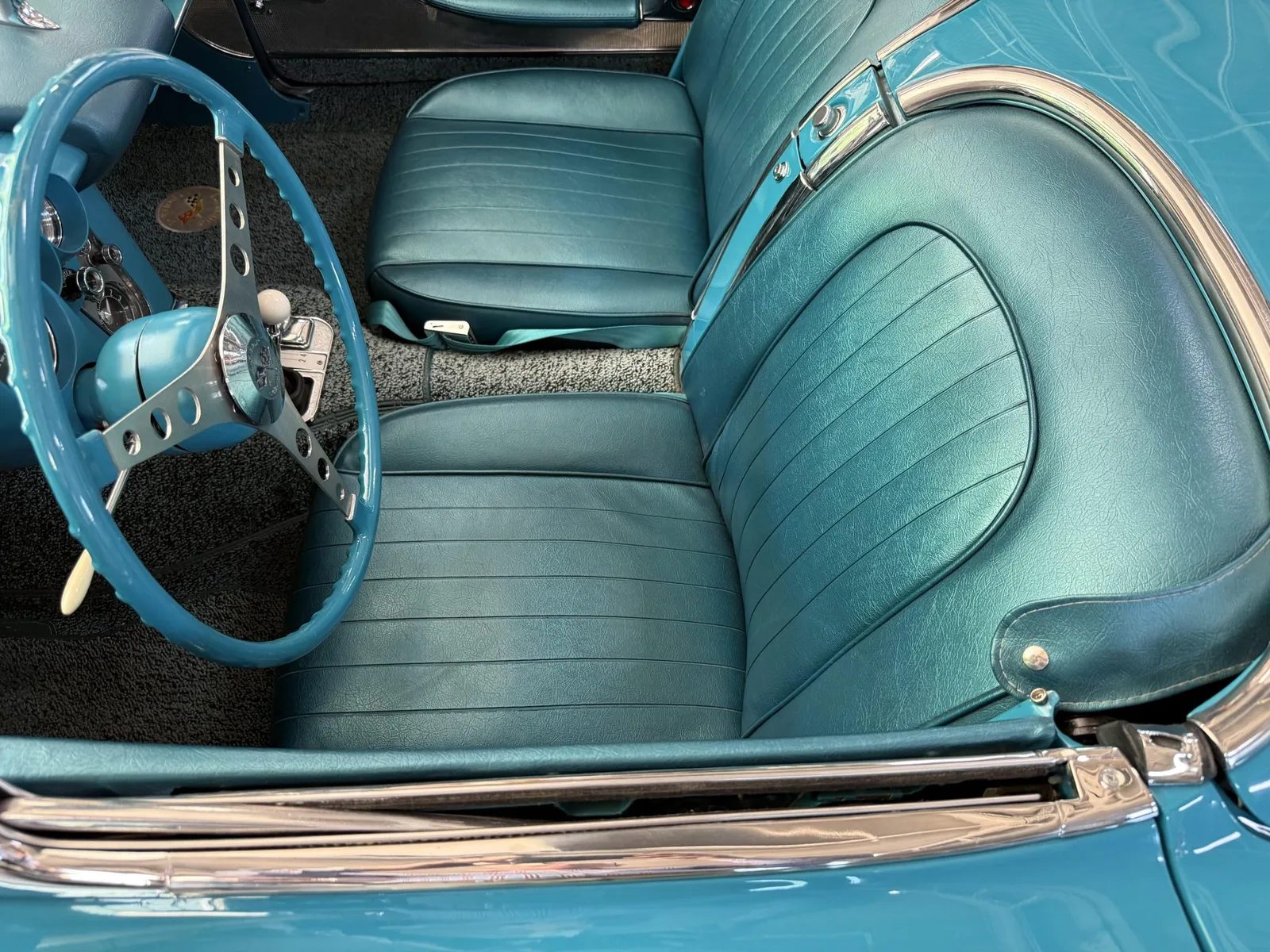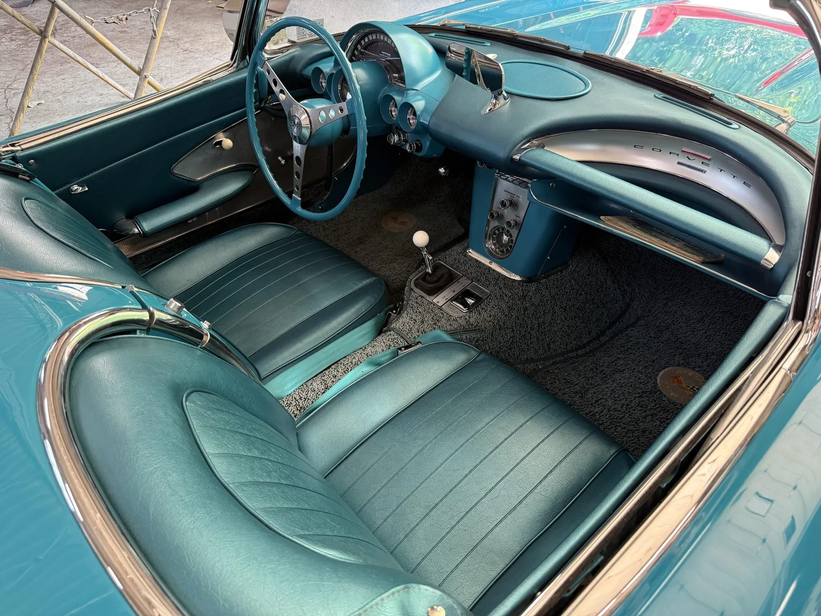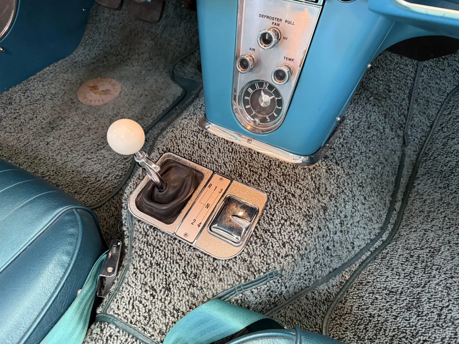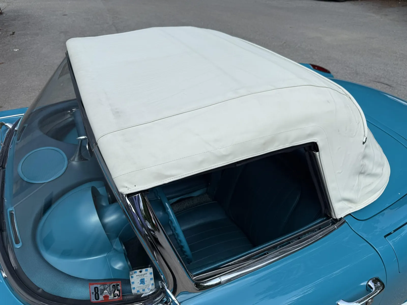 Chevrolet Corvette finished in turquoise over turquoise vinyl with a white convertible soft top, powered by a 283ci V8 and a four-speed manual transmission.