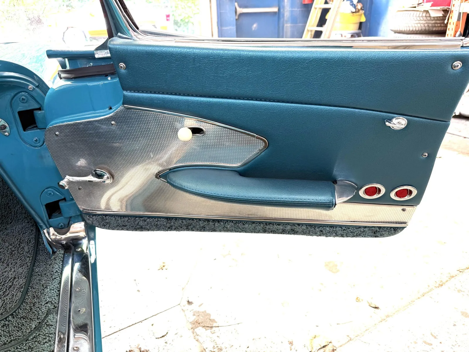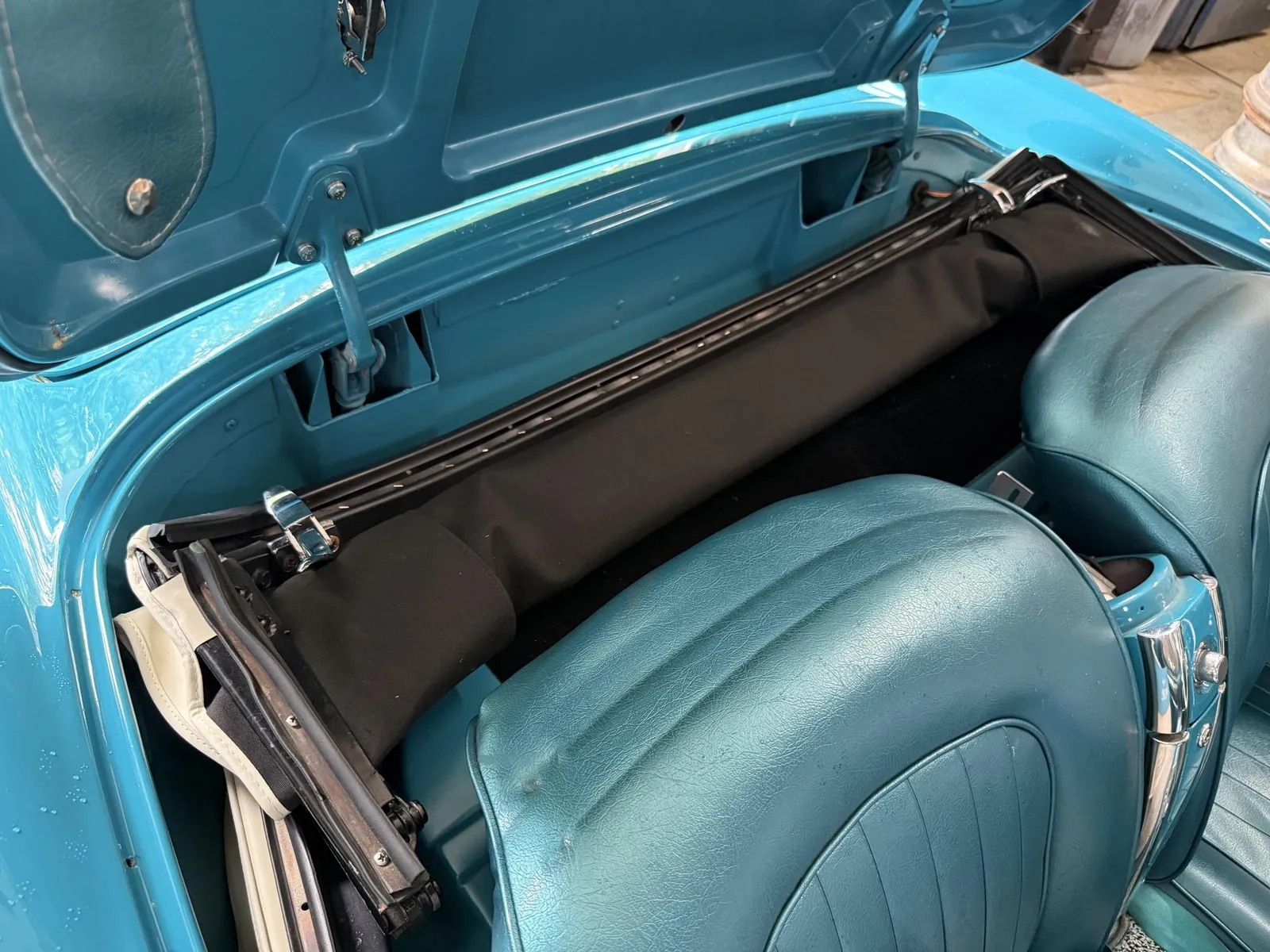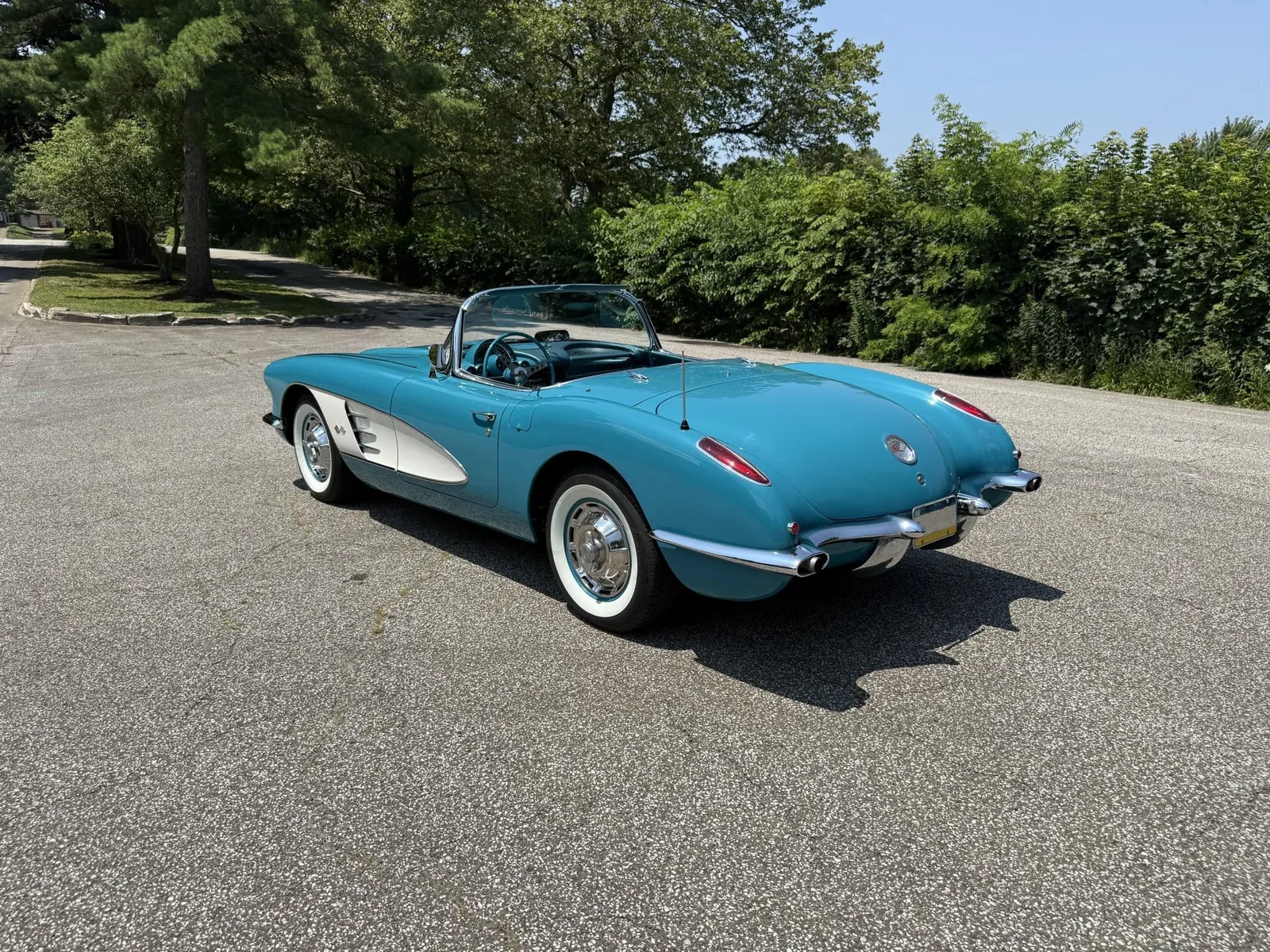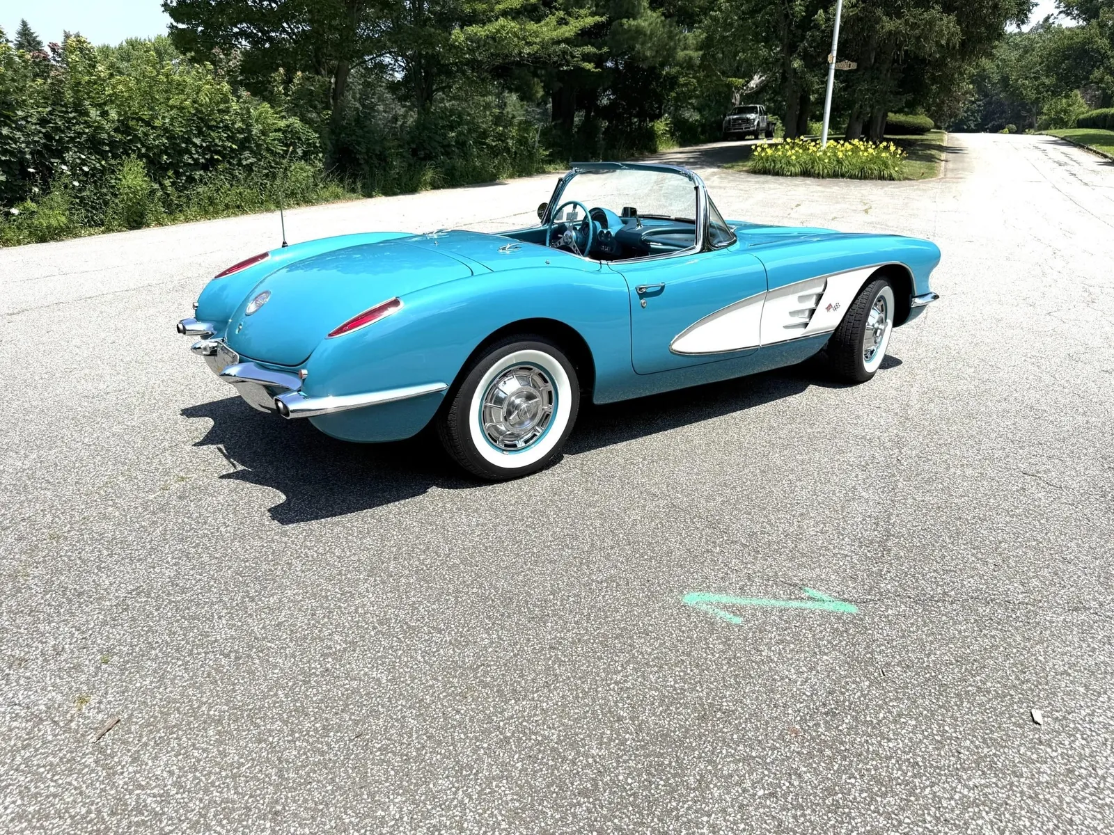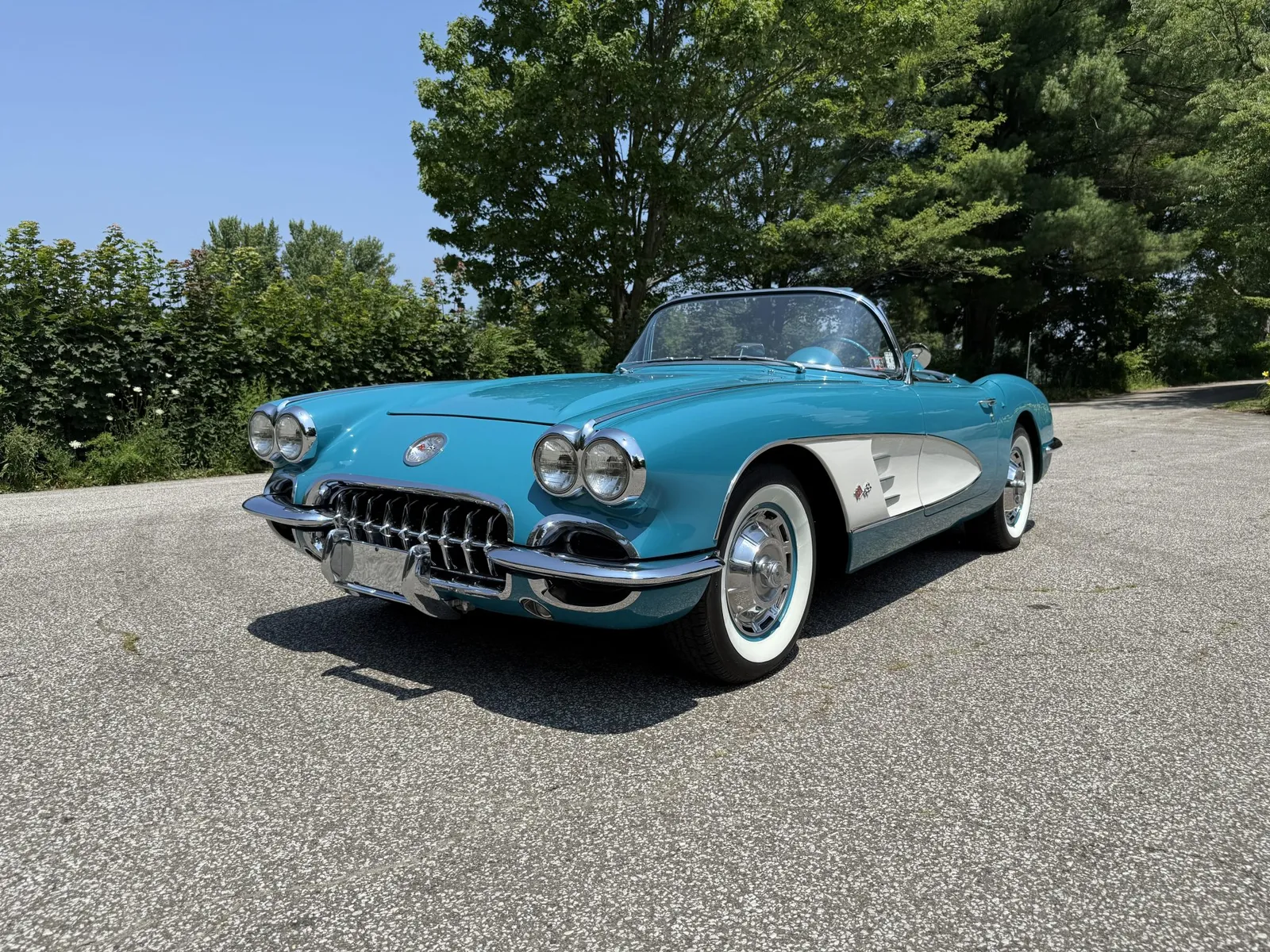 Chevrolet Corvette finished in turquoise over turquoise vinyl with a white convertible soft top, powered by a 283ci V8 and a four-speed manual transmission.