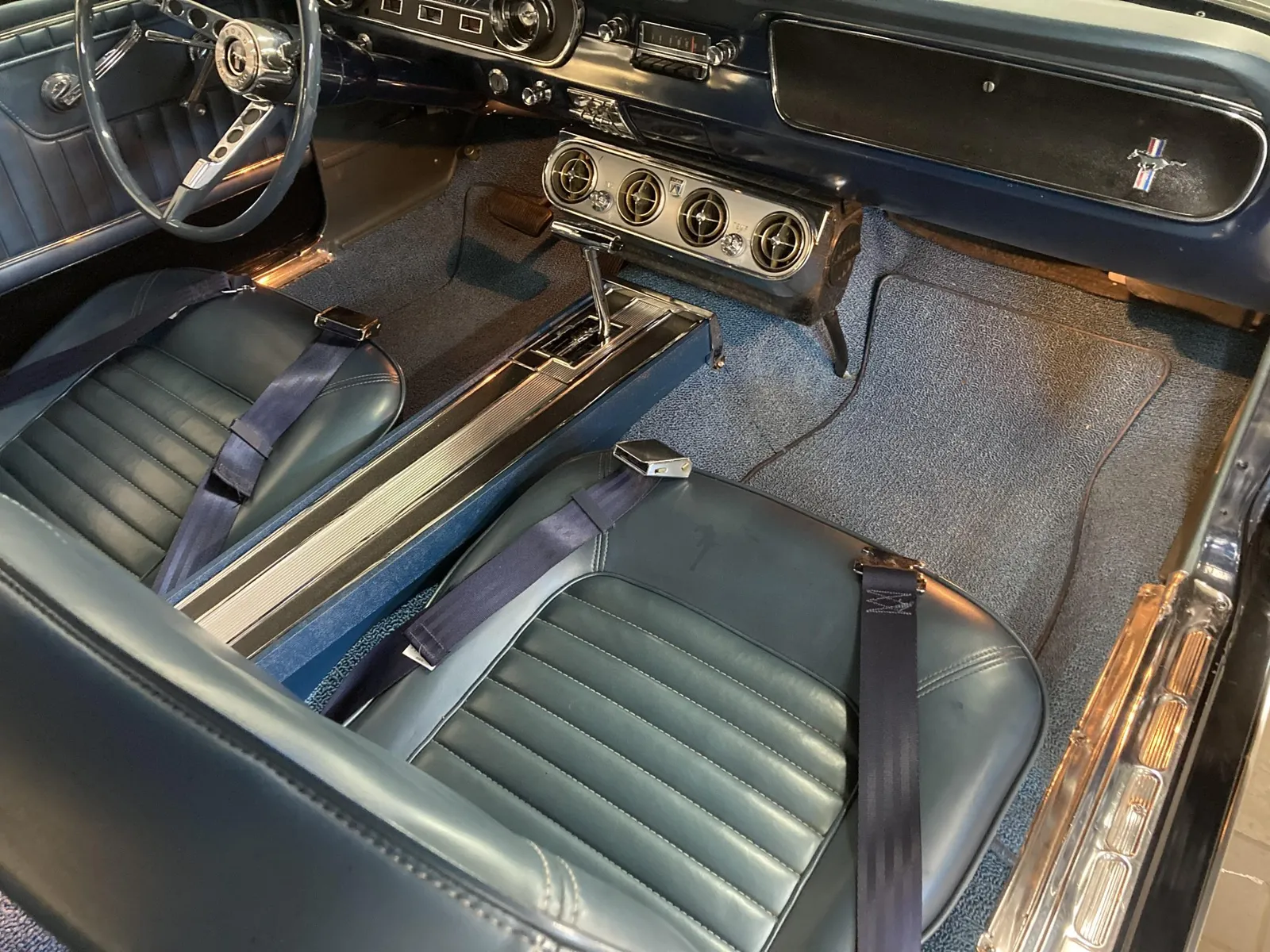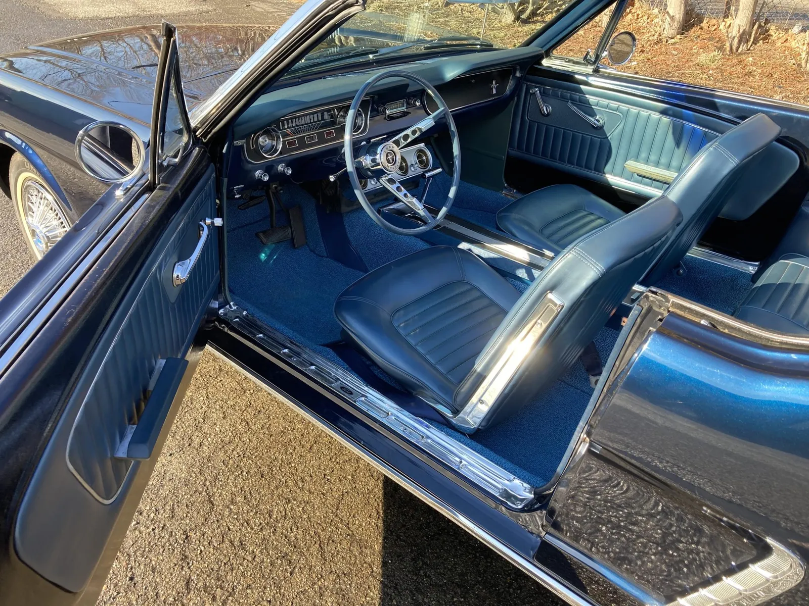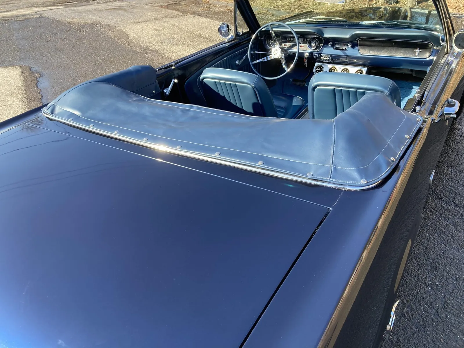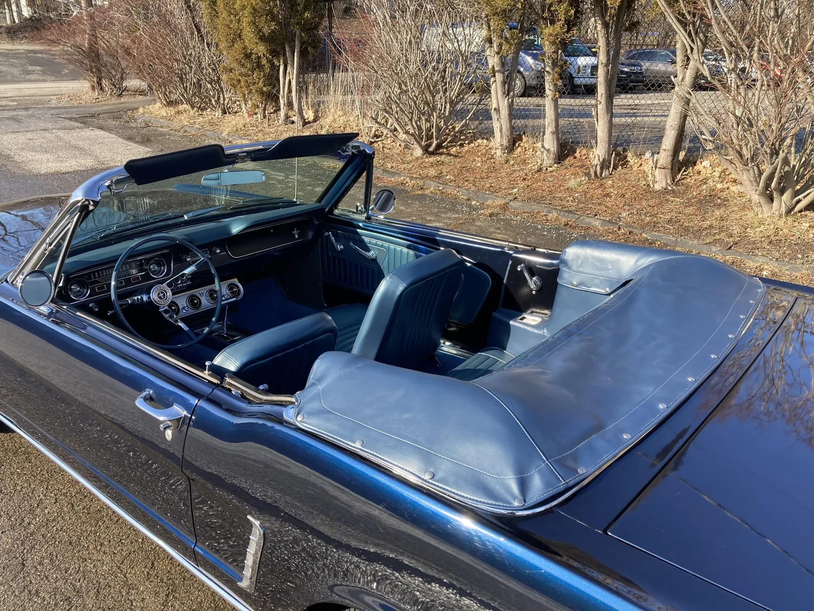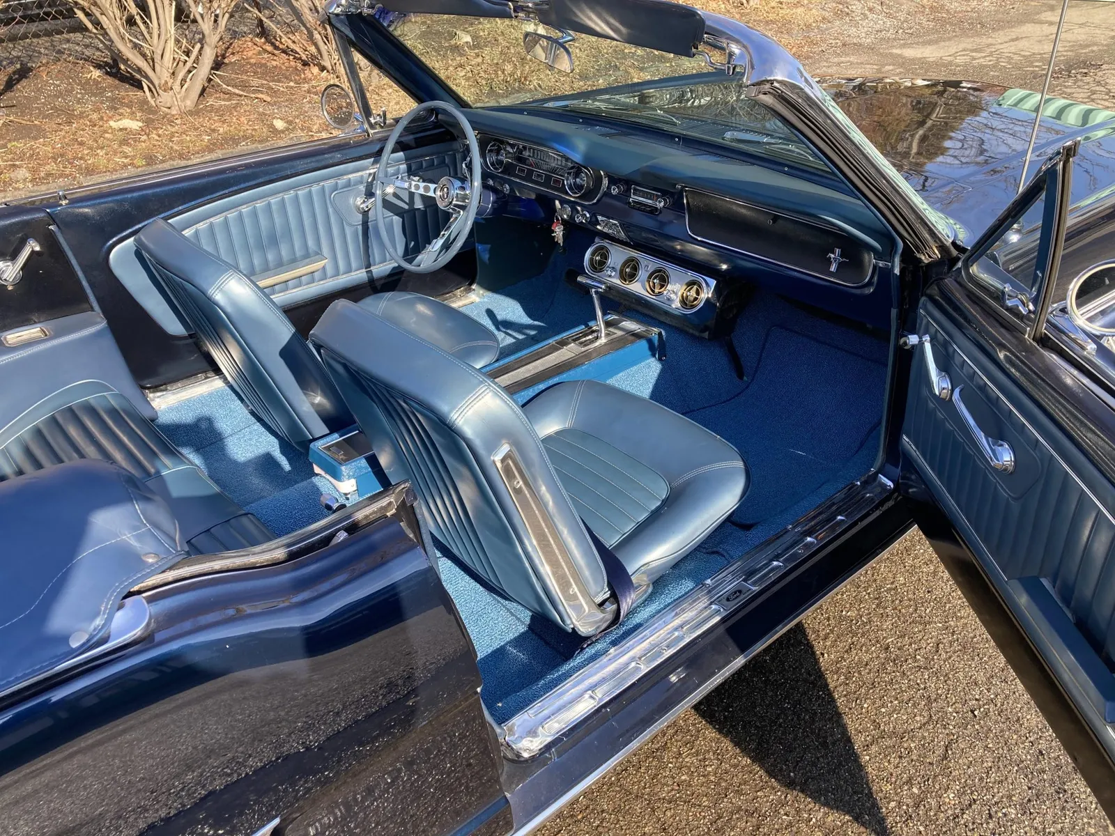Ford Mustang convertible finished in blue over blue vinyl upholstery, featuring a 289ci V8 and a rebuilt three-speed automatic transmission.