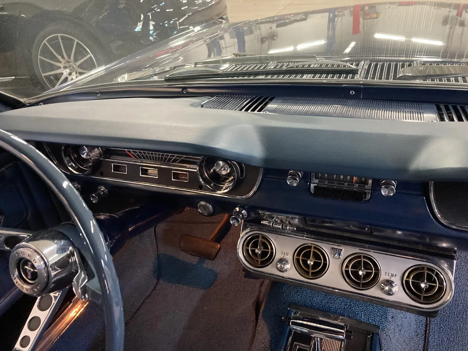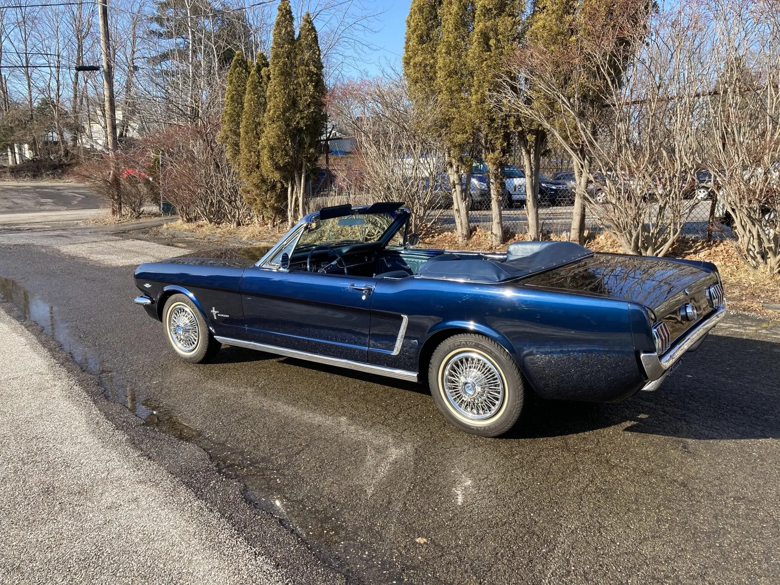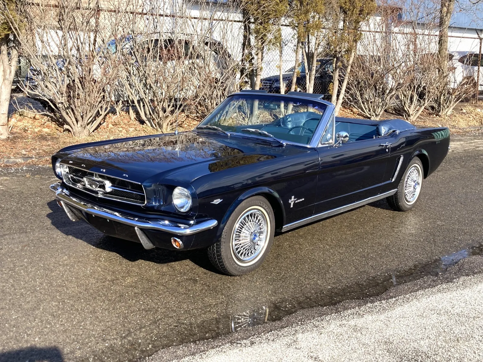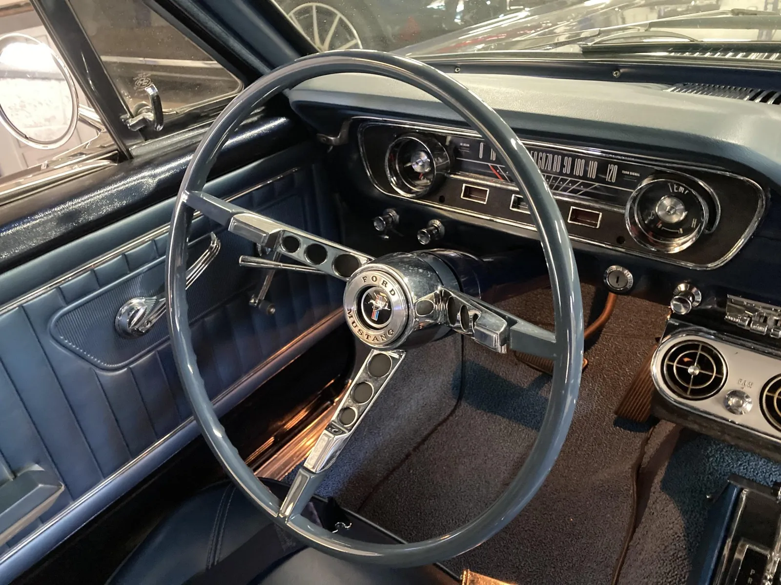 Ford Mustang convertible finished in blue over blue vinyl upholstery, featuring a 289ci V8 and a rebuilt three-speed automatic transmission.