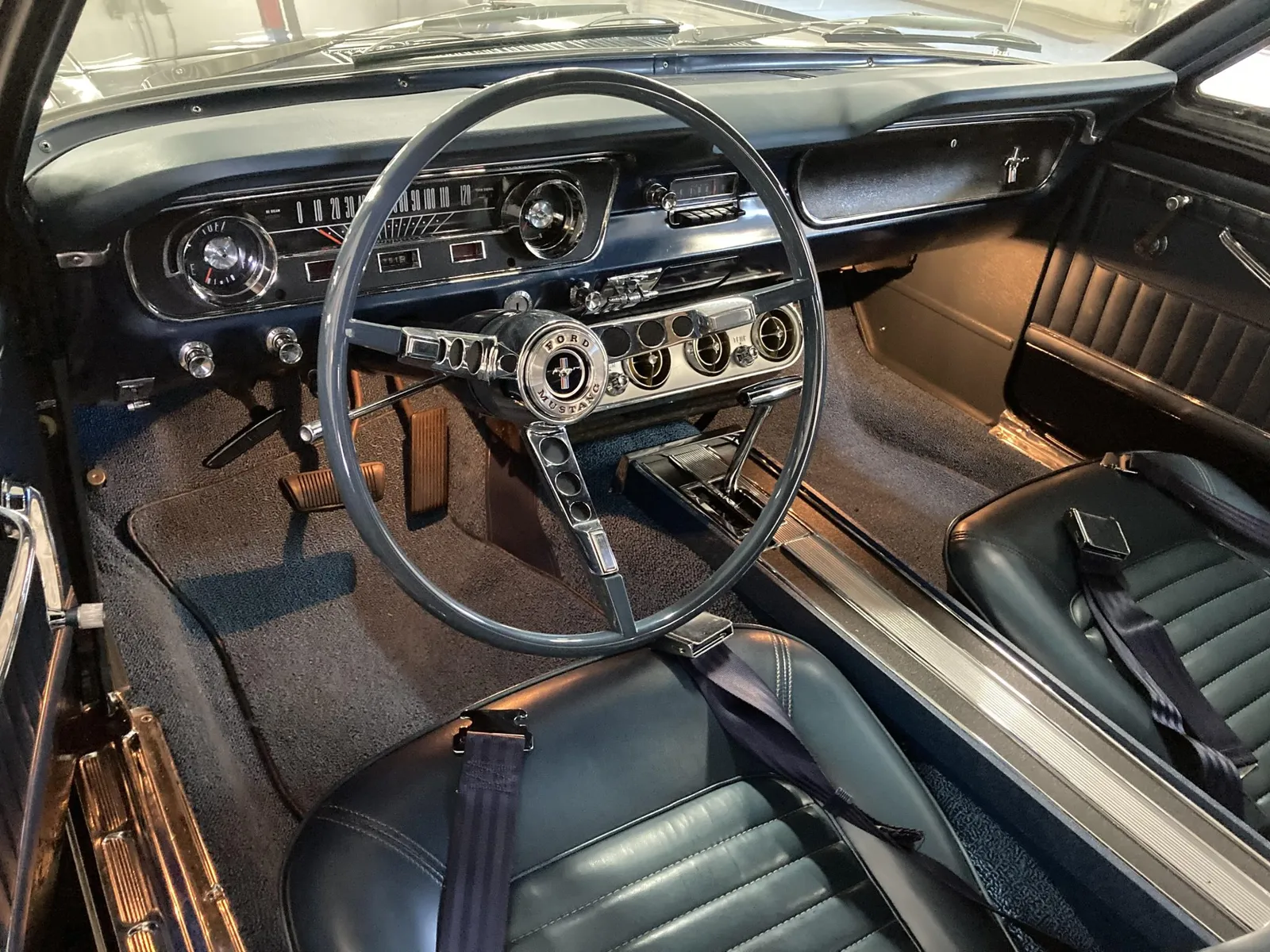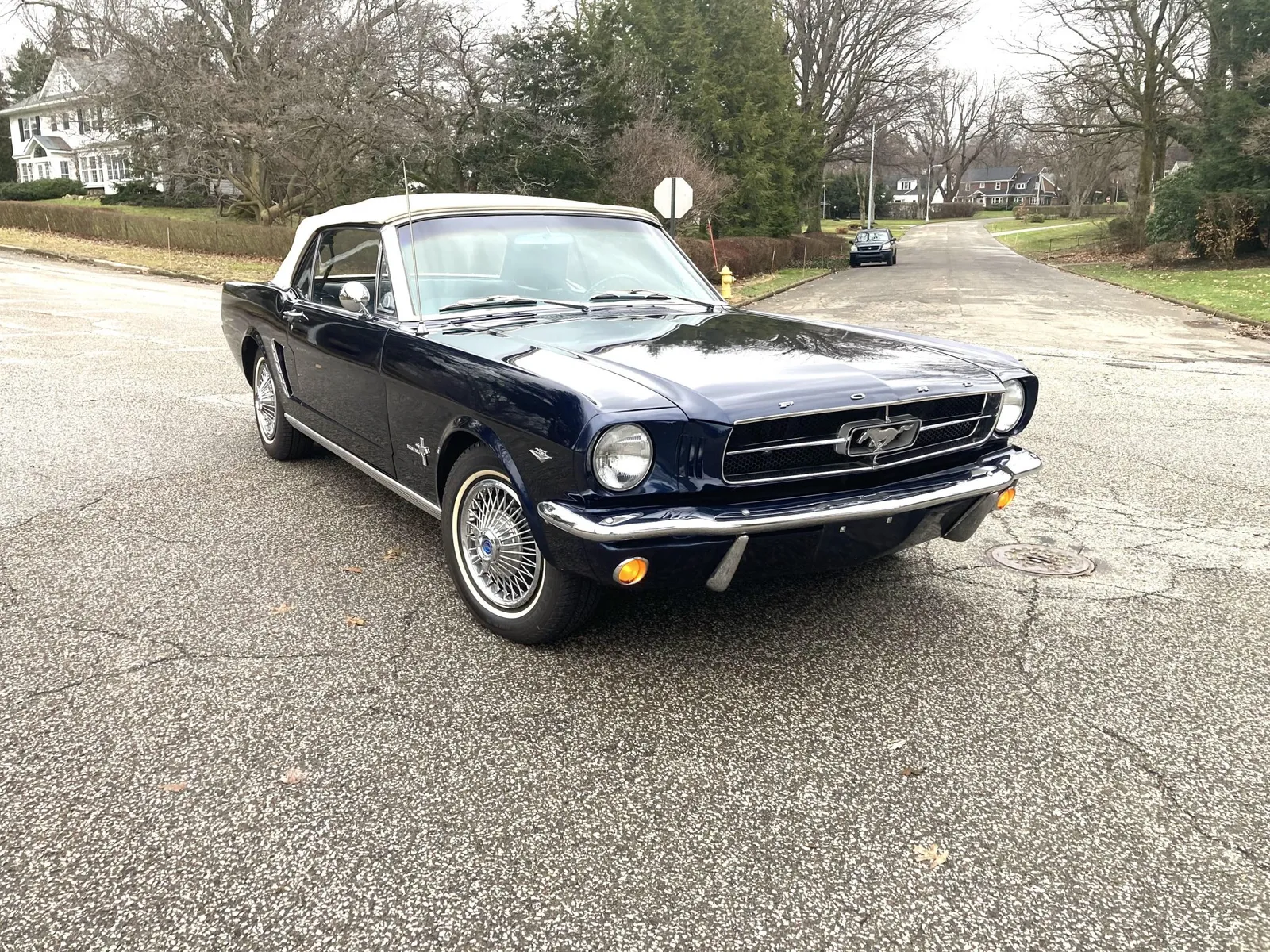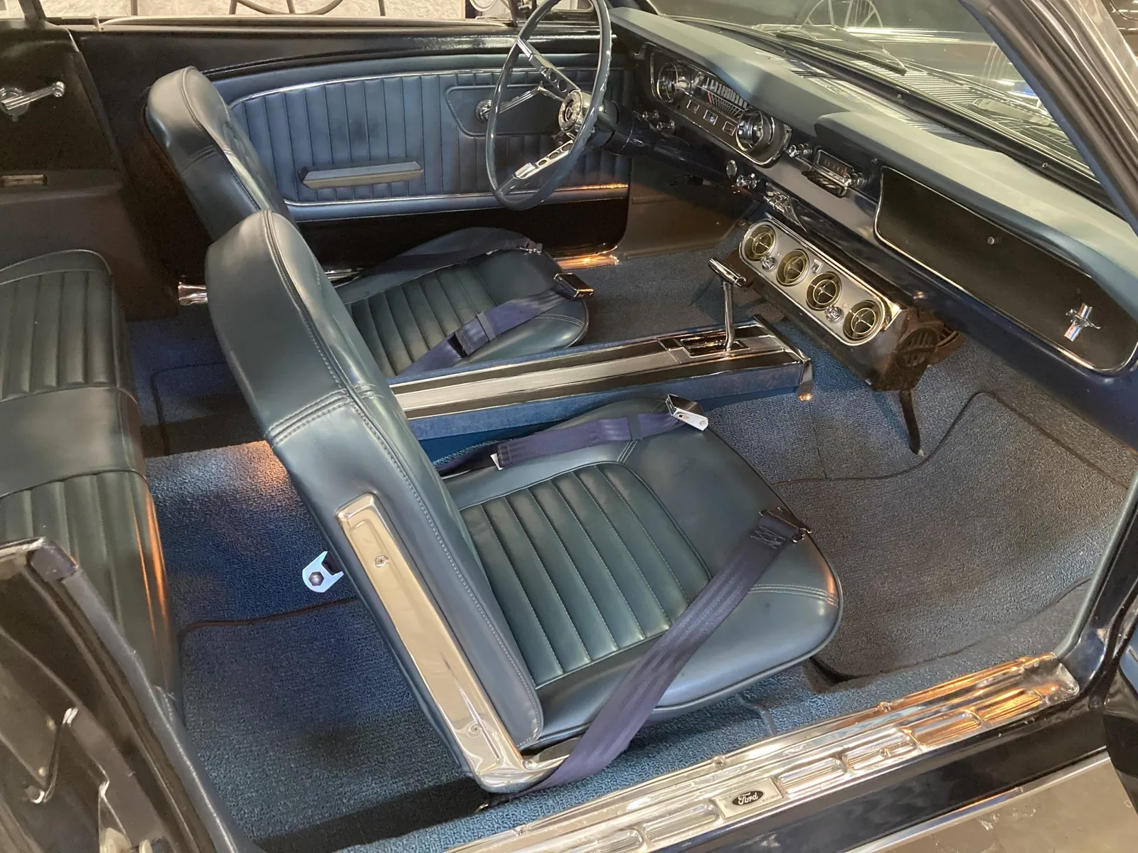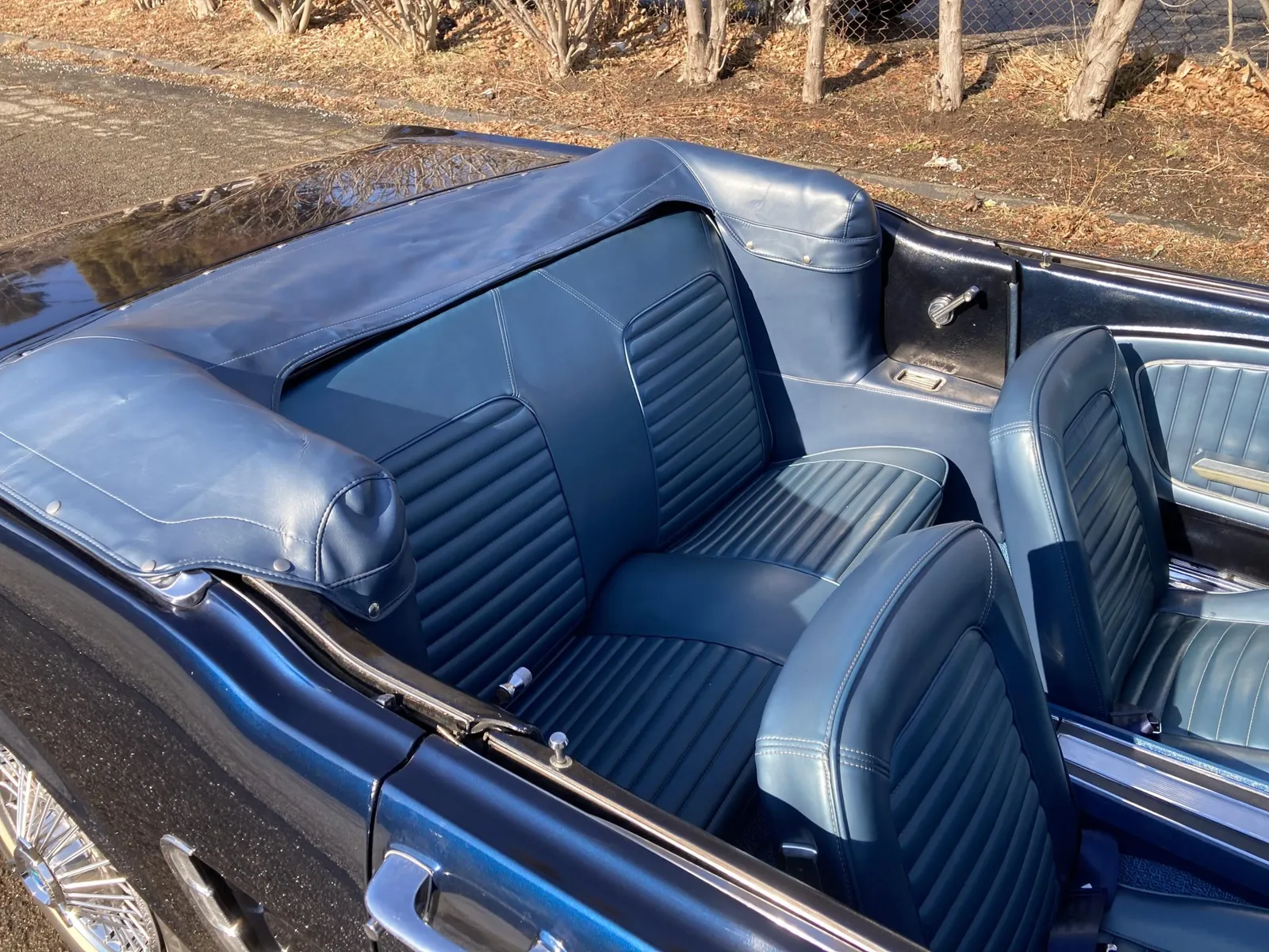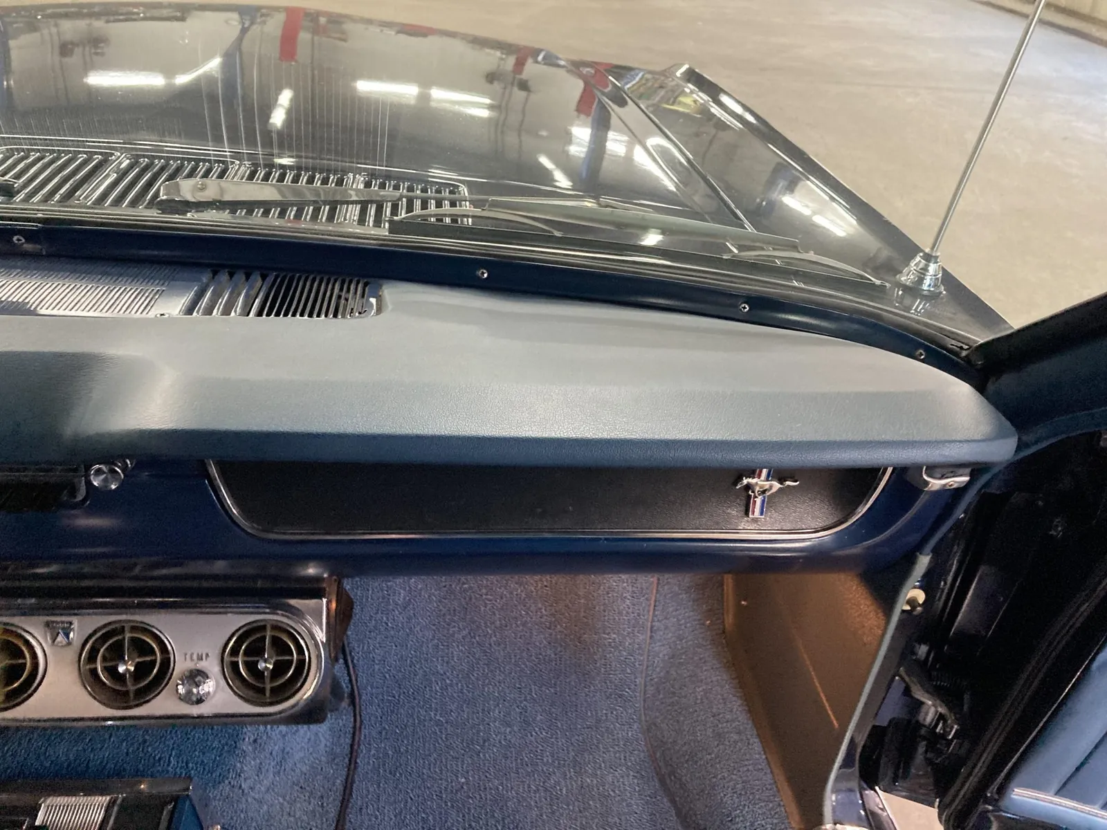 Ford Mustang convertible finished in blue over blue vinyl upholstery, featuring a 289ci V8 and a rebuilt three-speed automatic transmission.