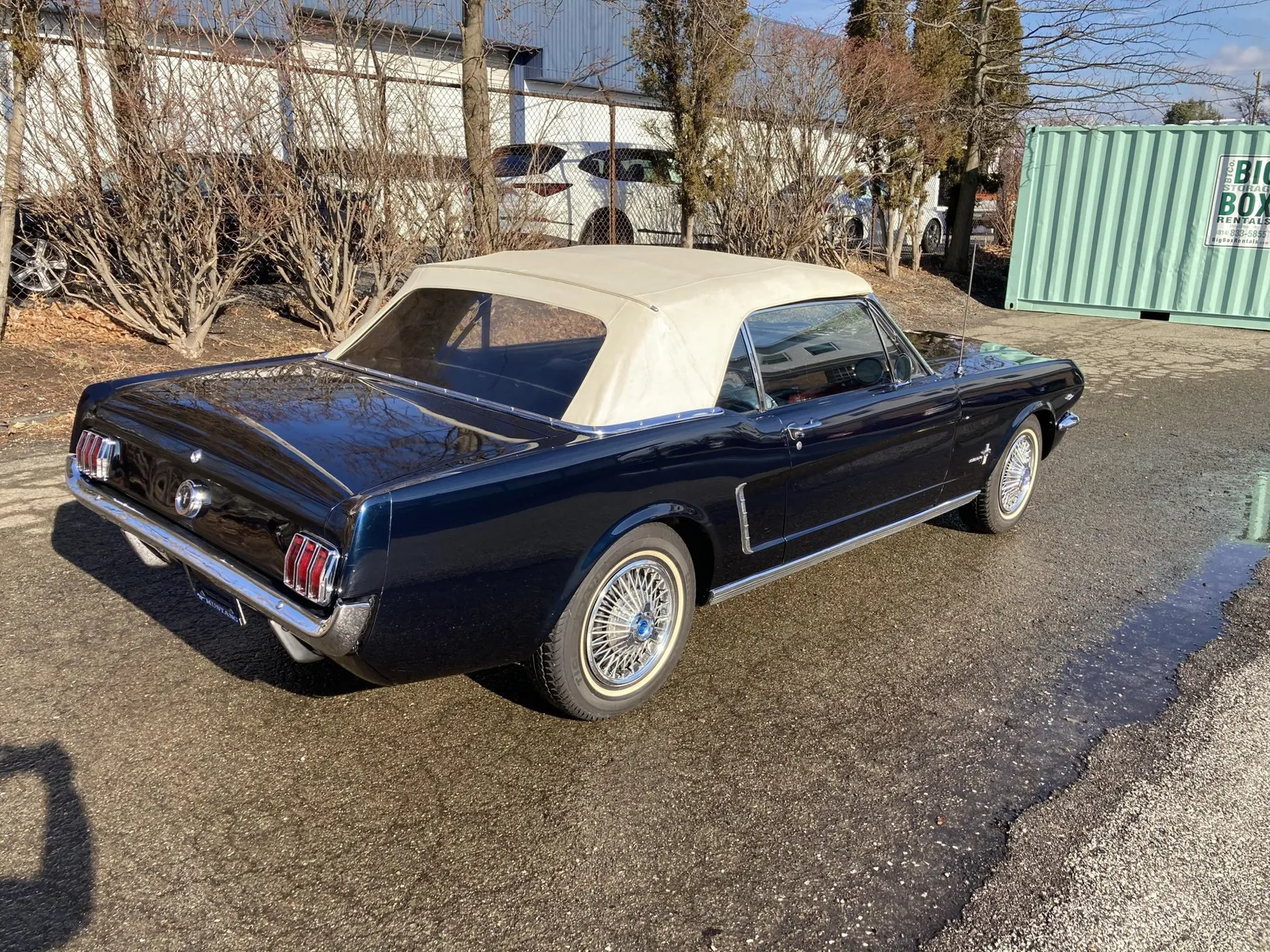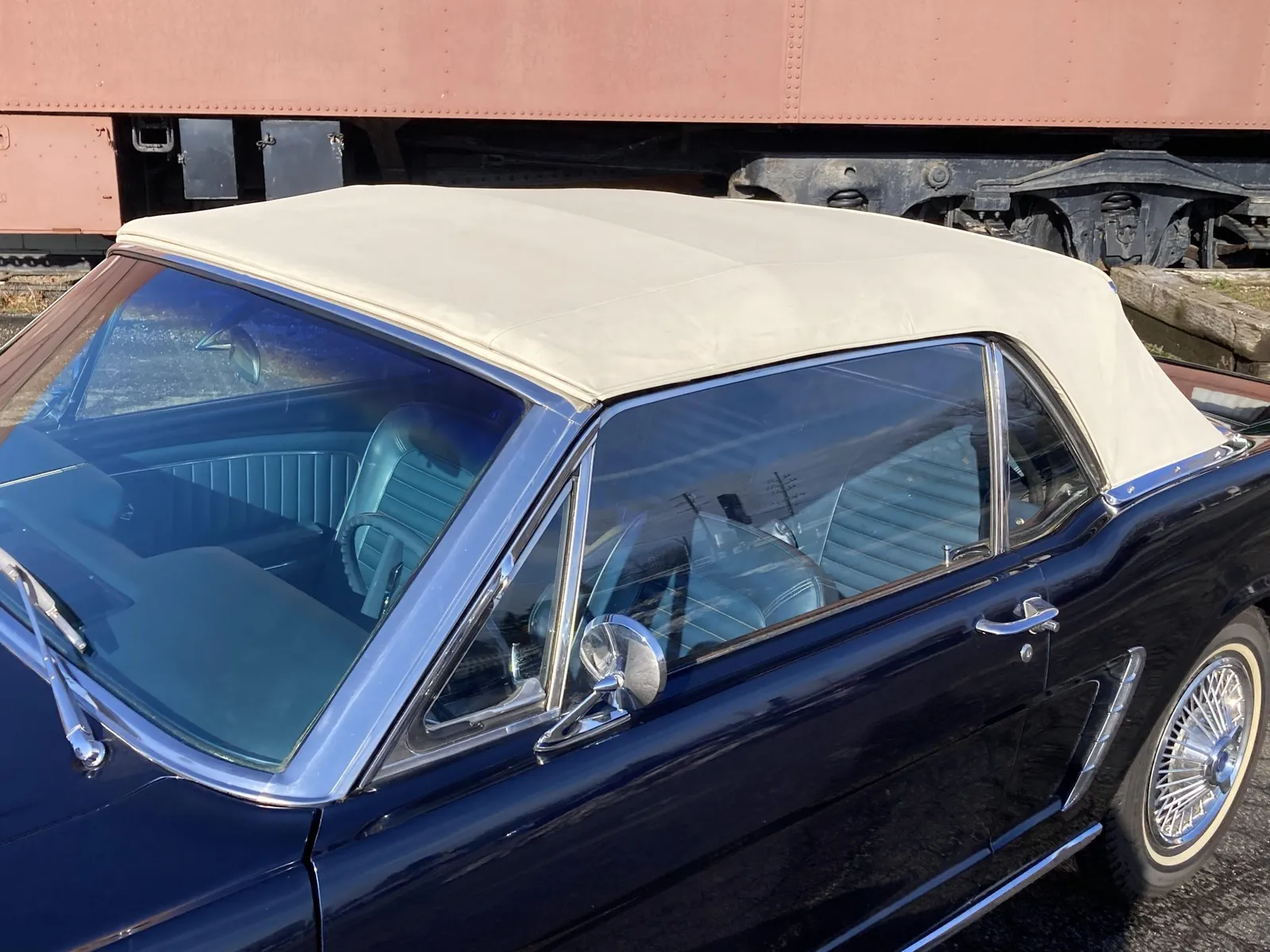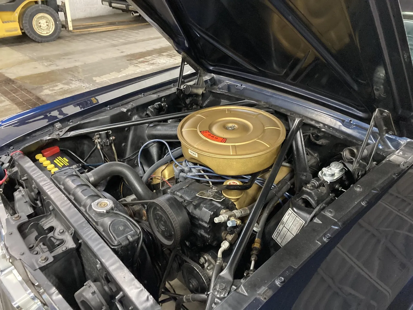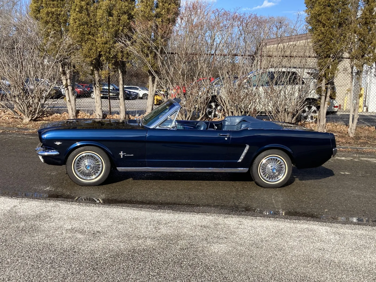 Ford Mustang convertible finished in blue over blue vinyl upholstery, featuring a 289ci V8 and a rebuilt three-speed automatic transmission.