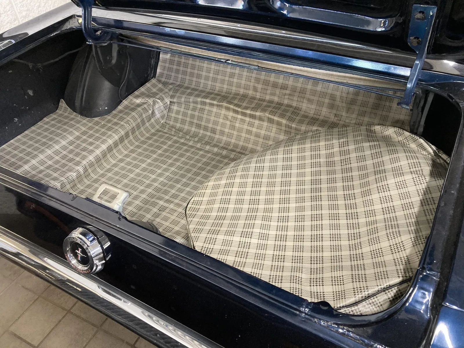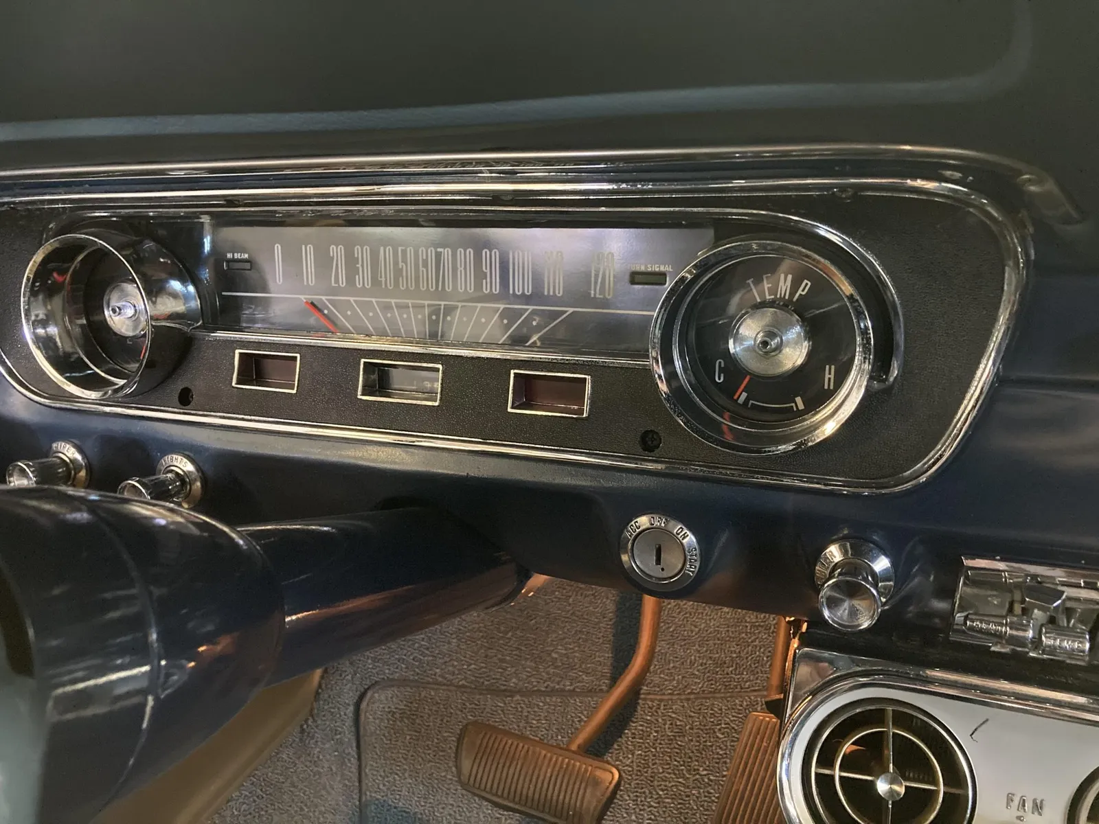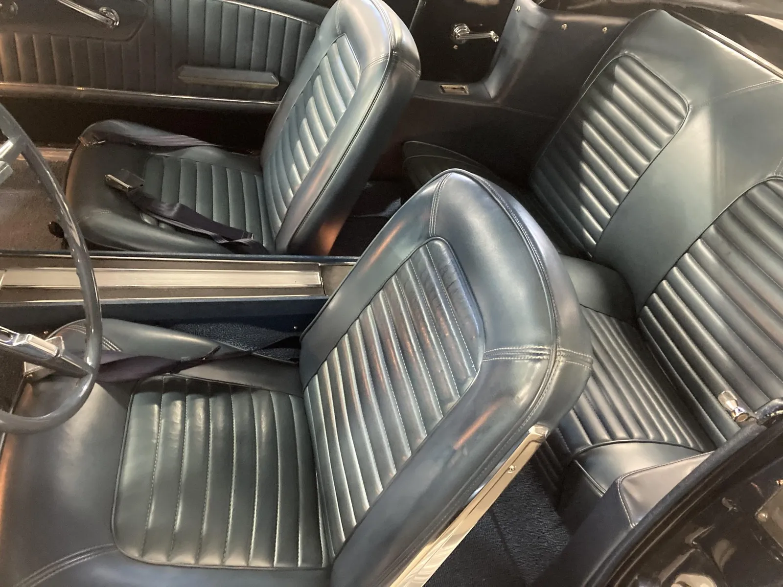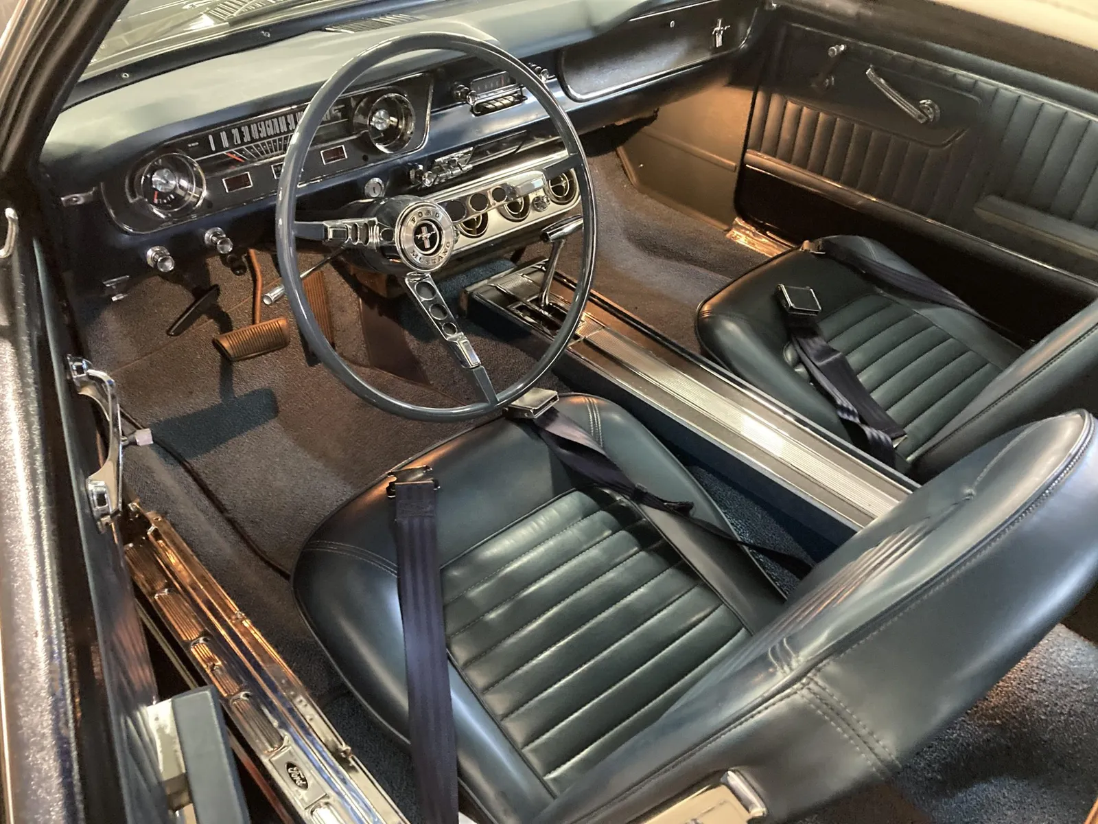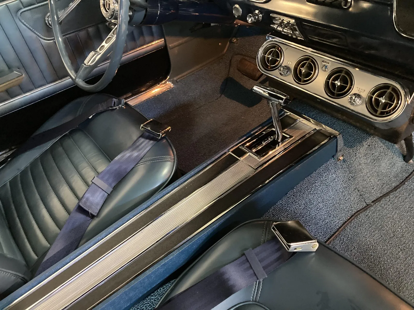 Ford Mustang convertible finished in blue over blue vinyl upholstery, featuring a 289ci V8 and a rebuilt three-speed automatic transmission.