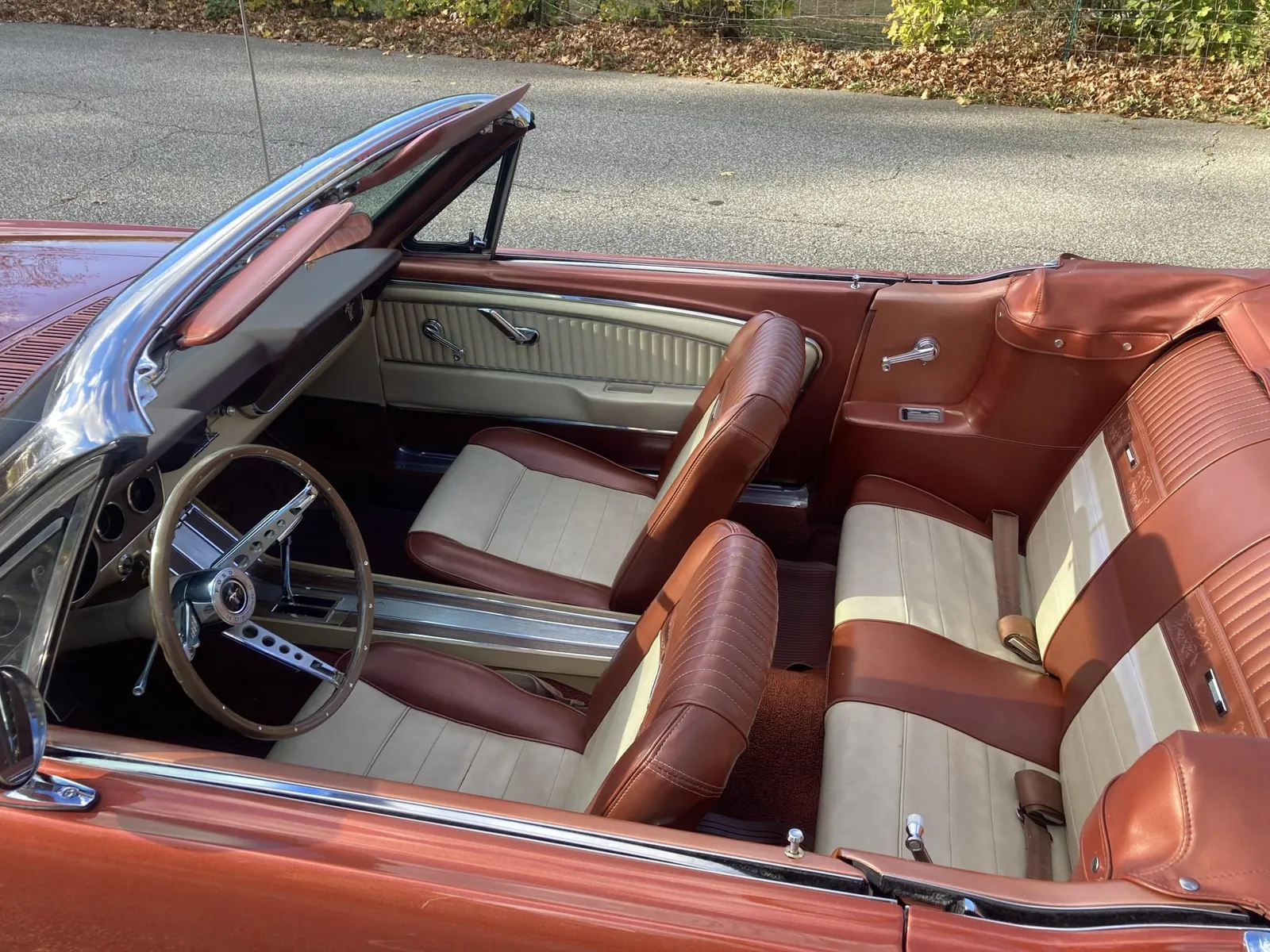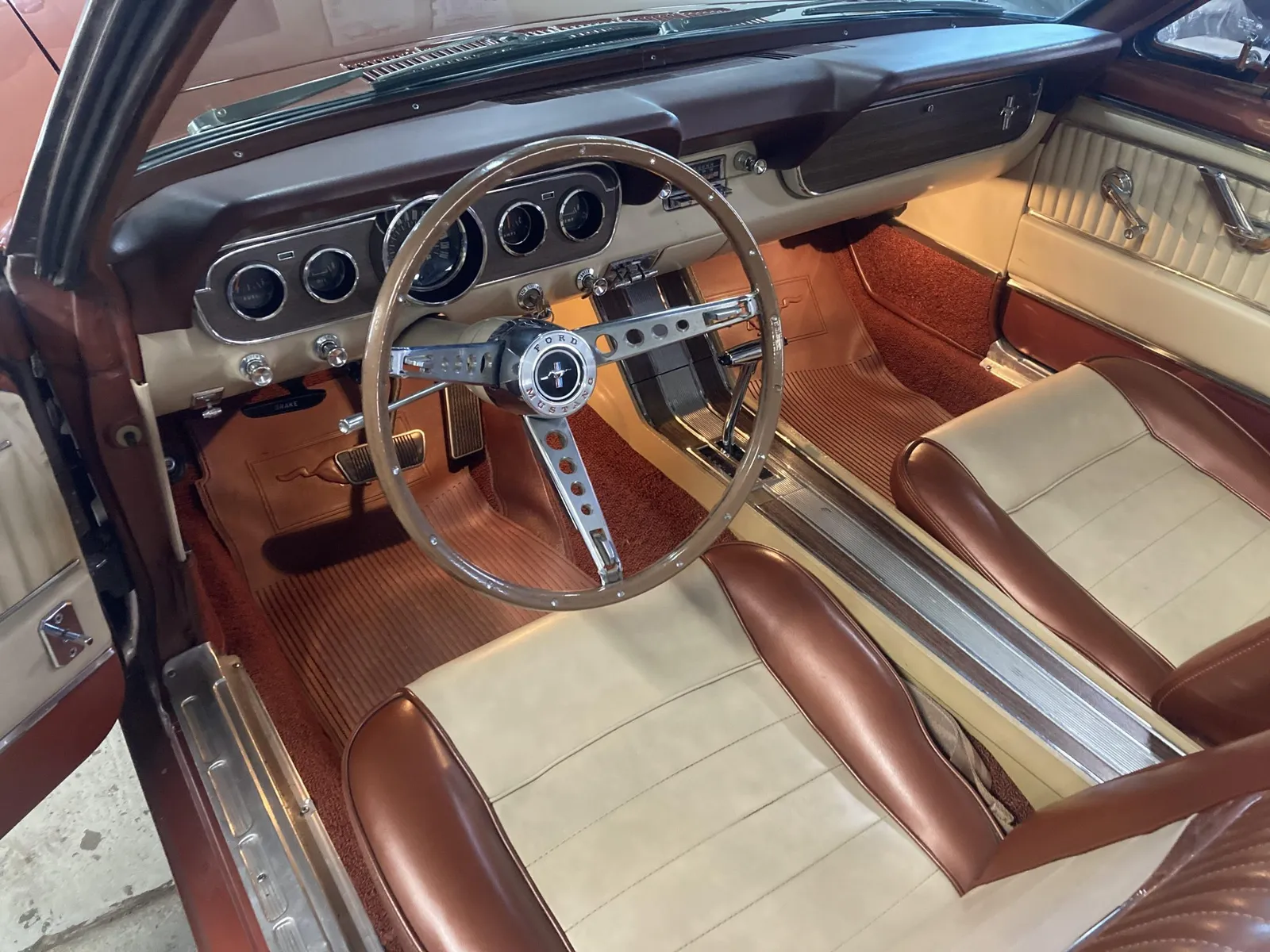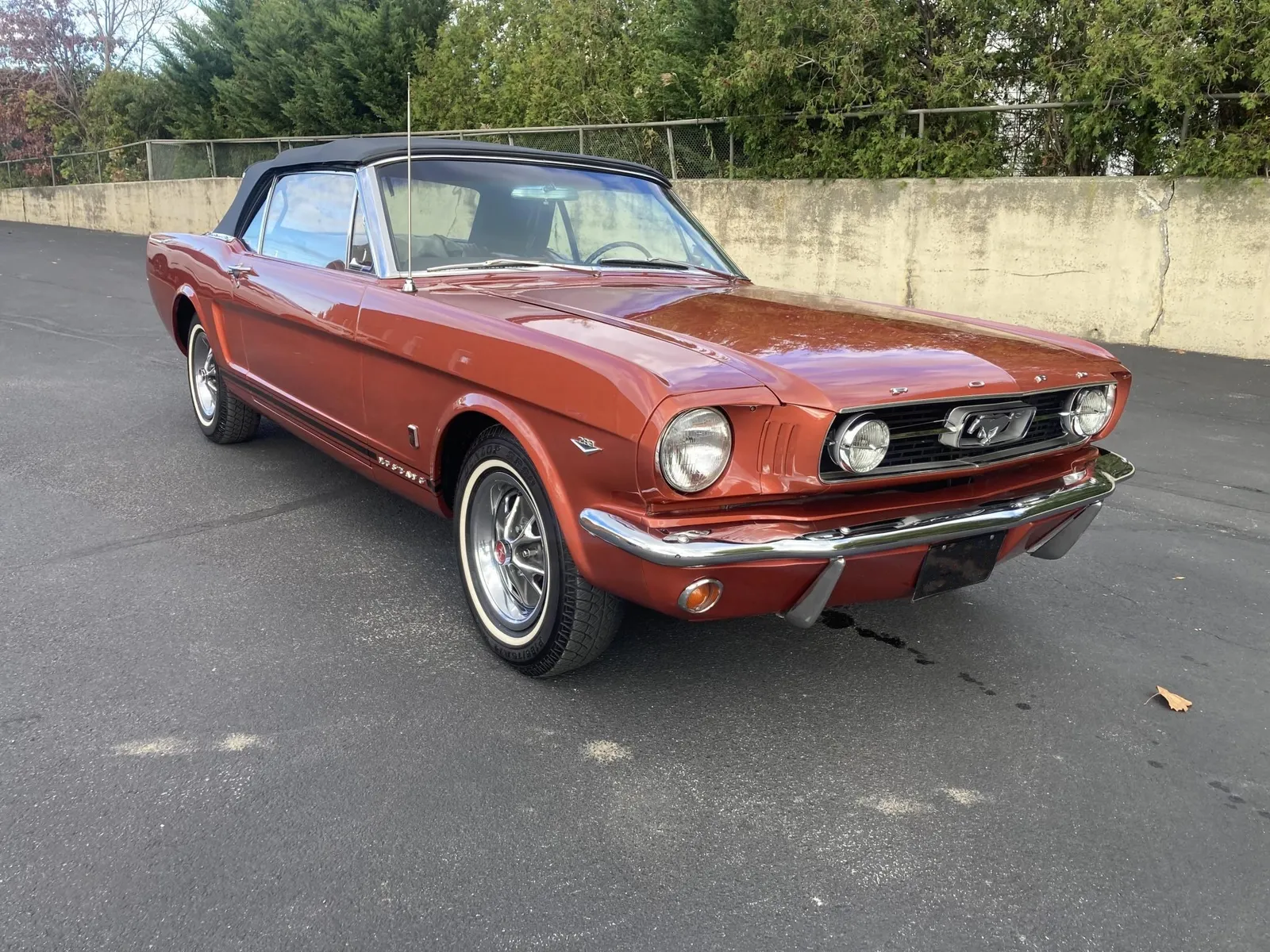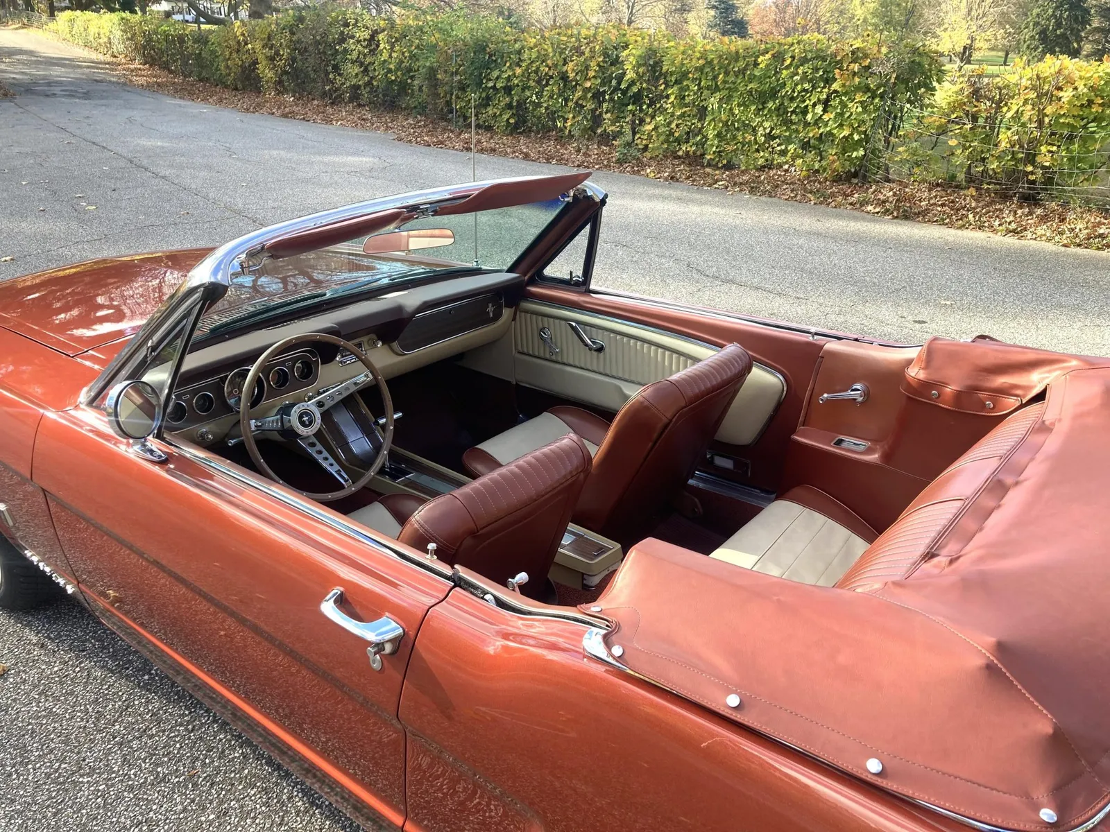 Mustang convertible finished in Emberglo over Emberglo and Parchment vinyl with a black soft top, powered by a 289ci V8 and a C4 three-speed automatic.