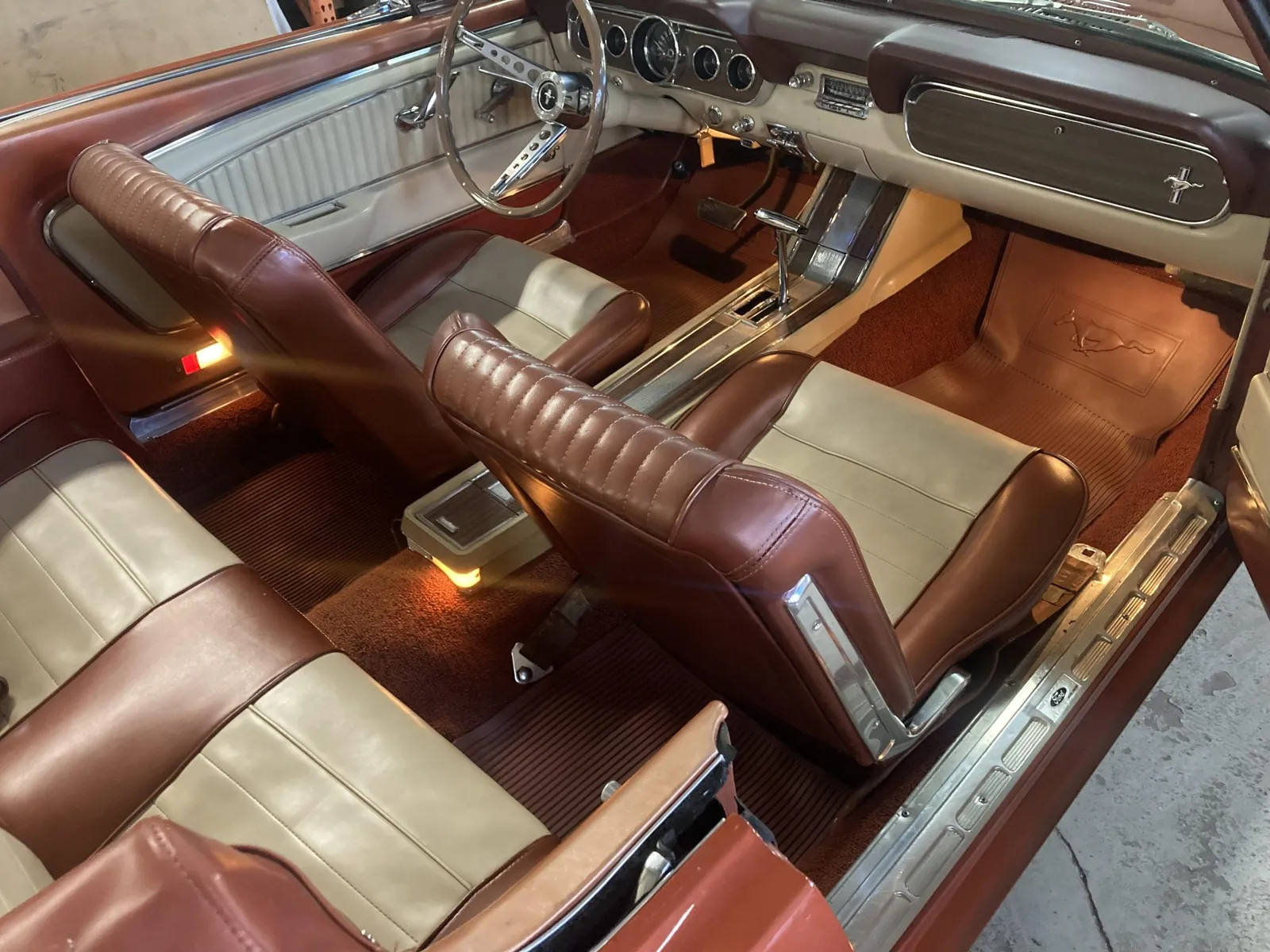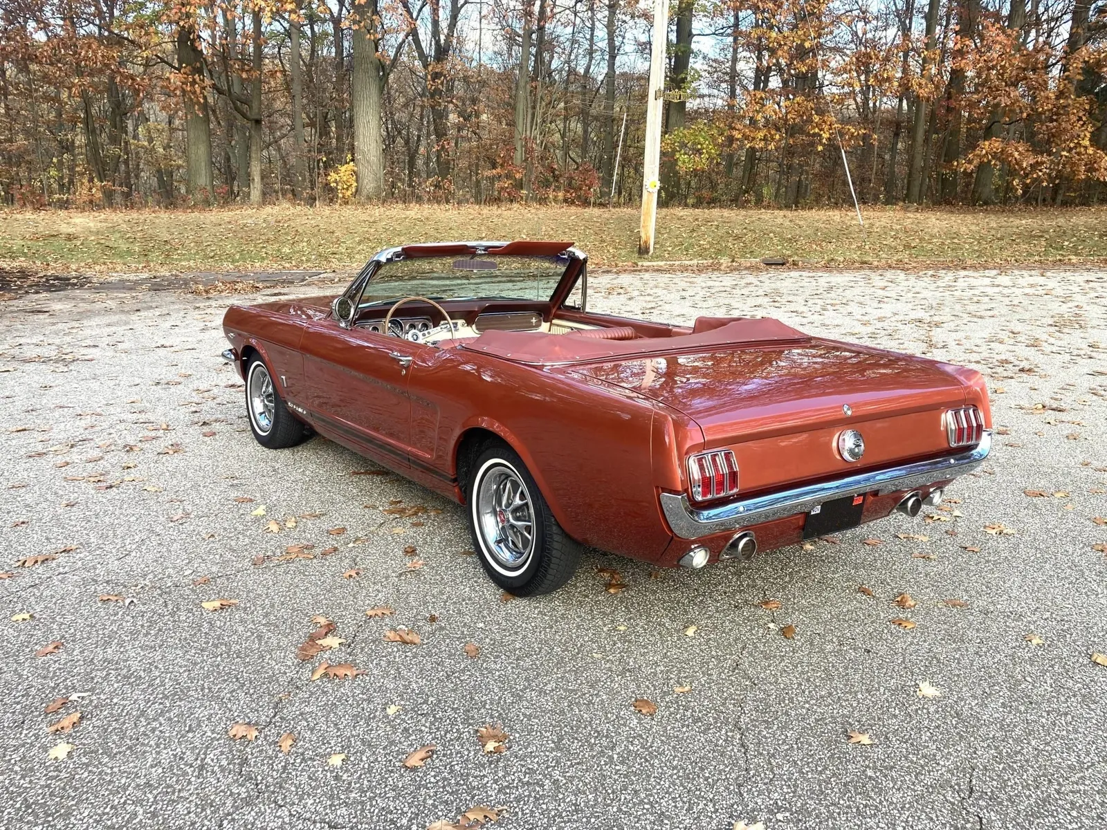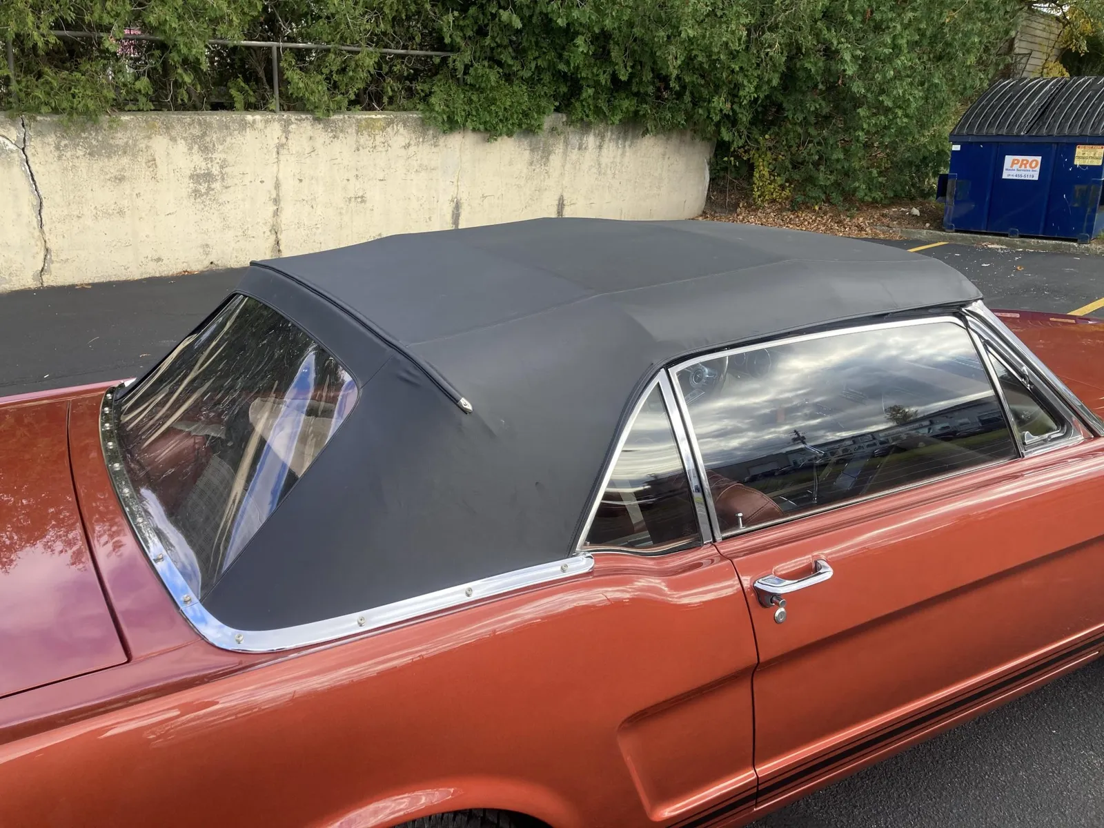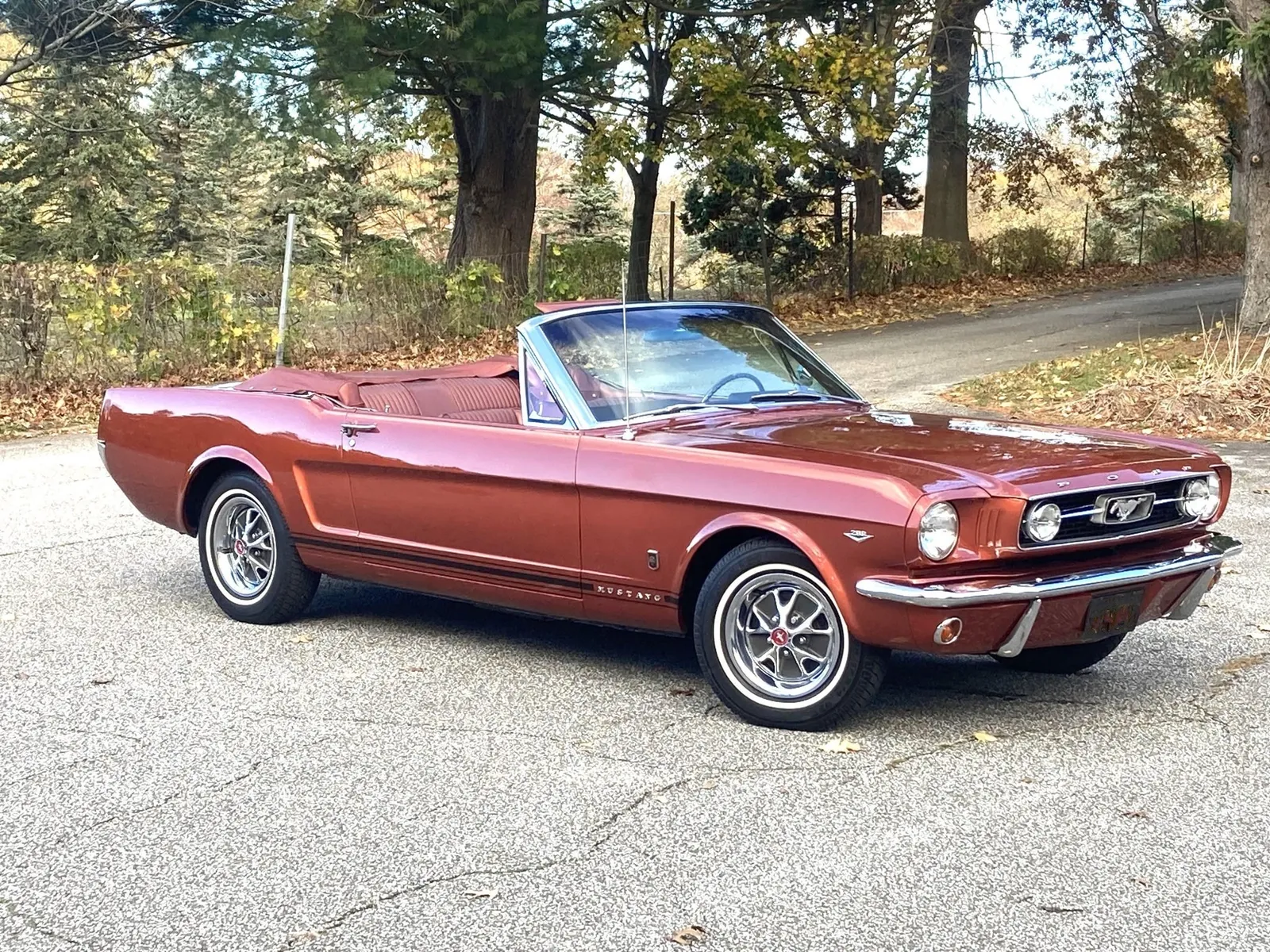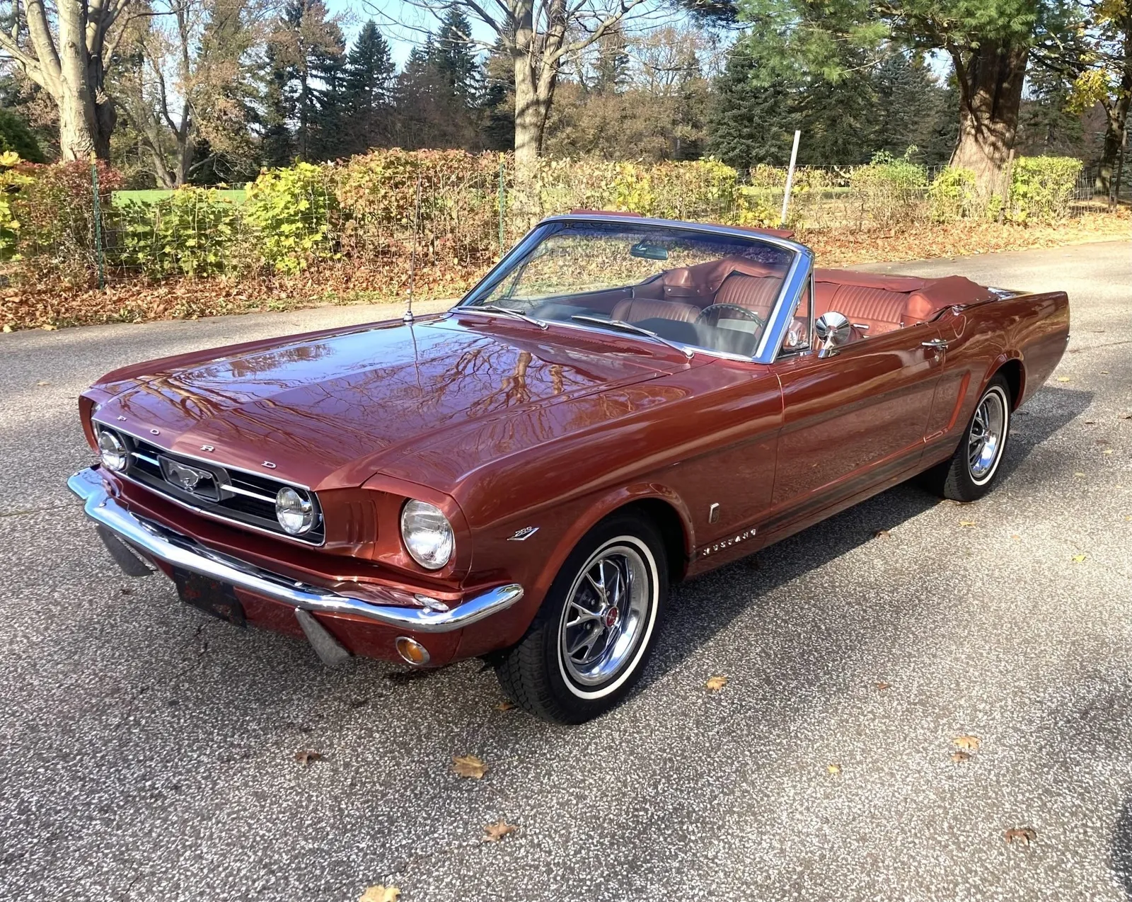 Mustang convertible finished in Emberglo over Emberglo and Parchment vinyl with a black soft top, powered by a 289ci V8 and a C4 three-speed automatic.
