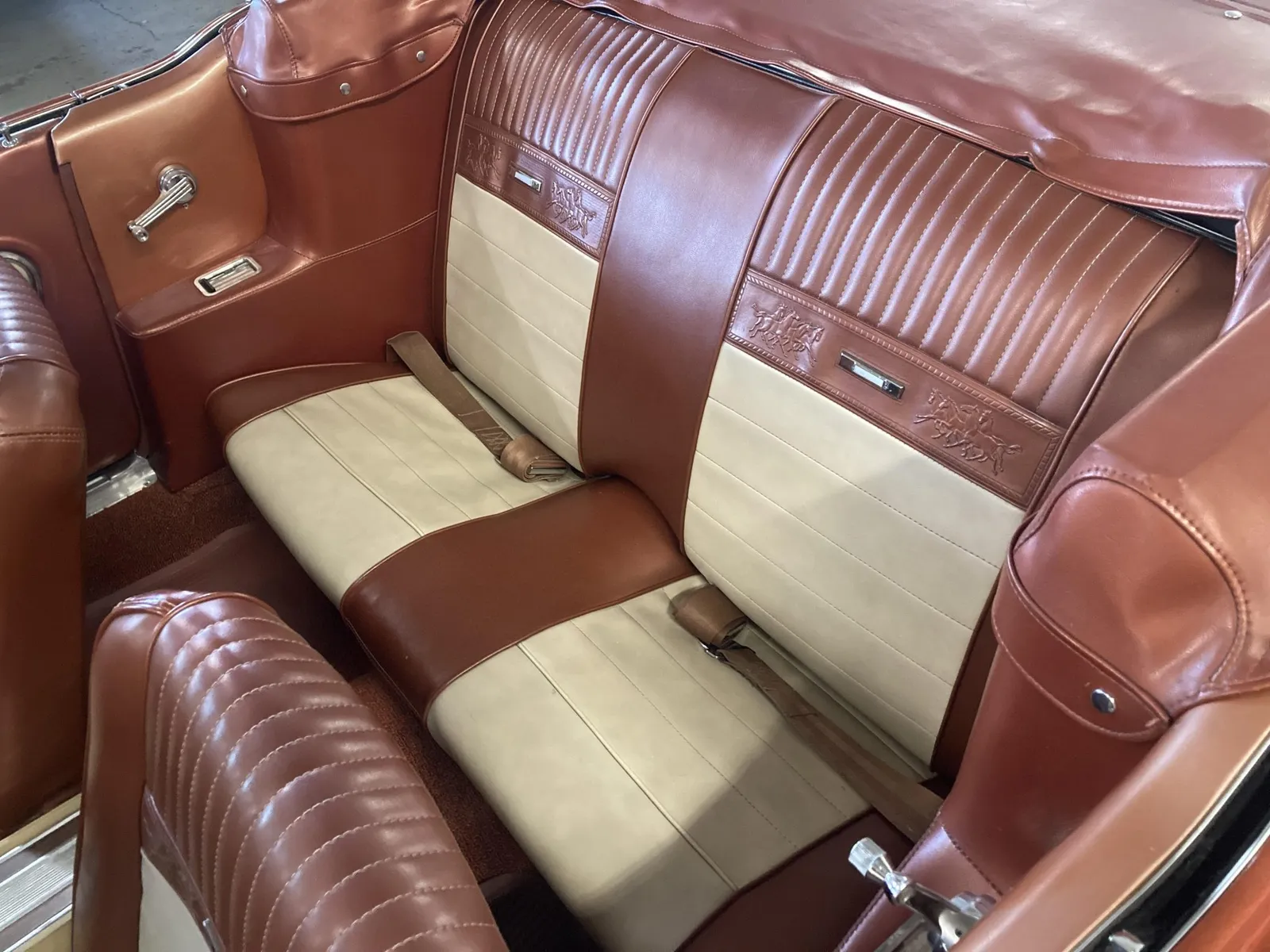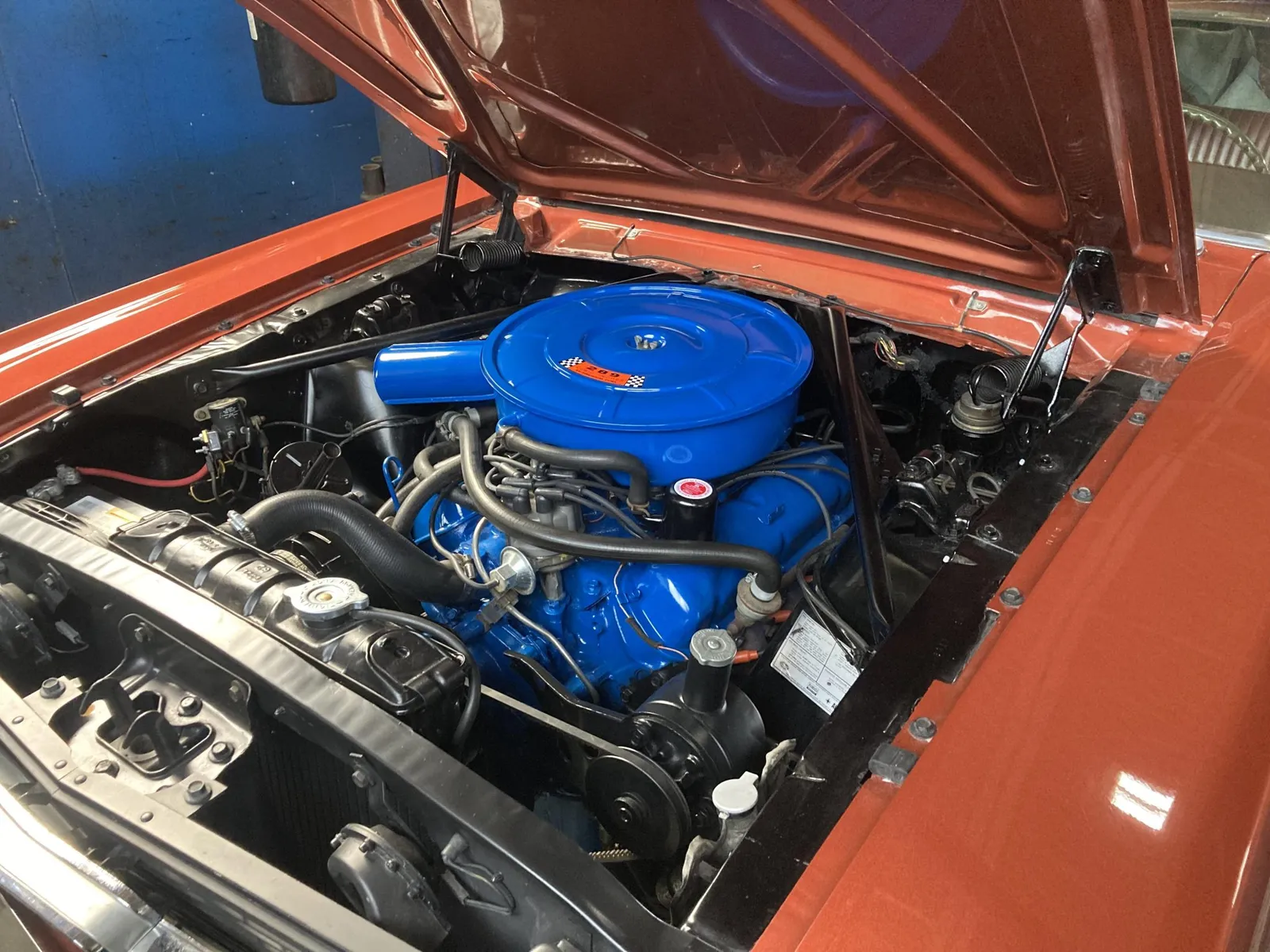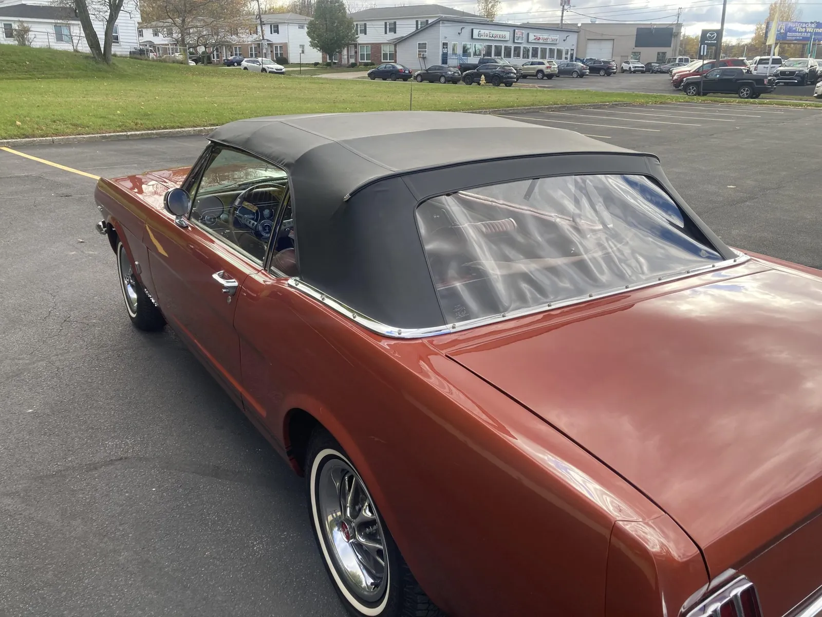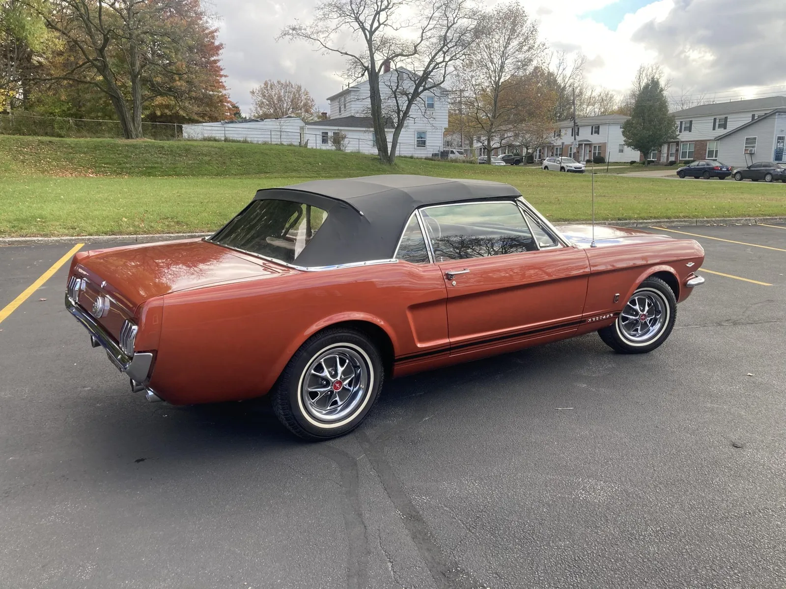Mustang convertible finished in Emberglo over Emberglo and Parchment vinyl with a black soft top, powered by a 289ci V8 and a C4 three-speed automatic.