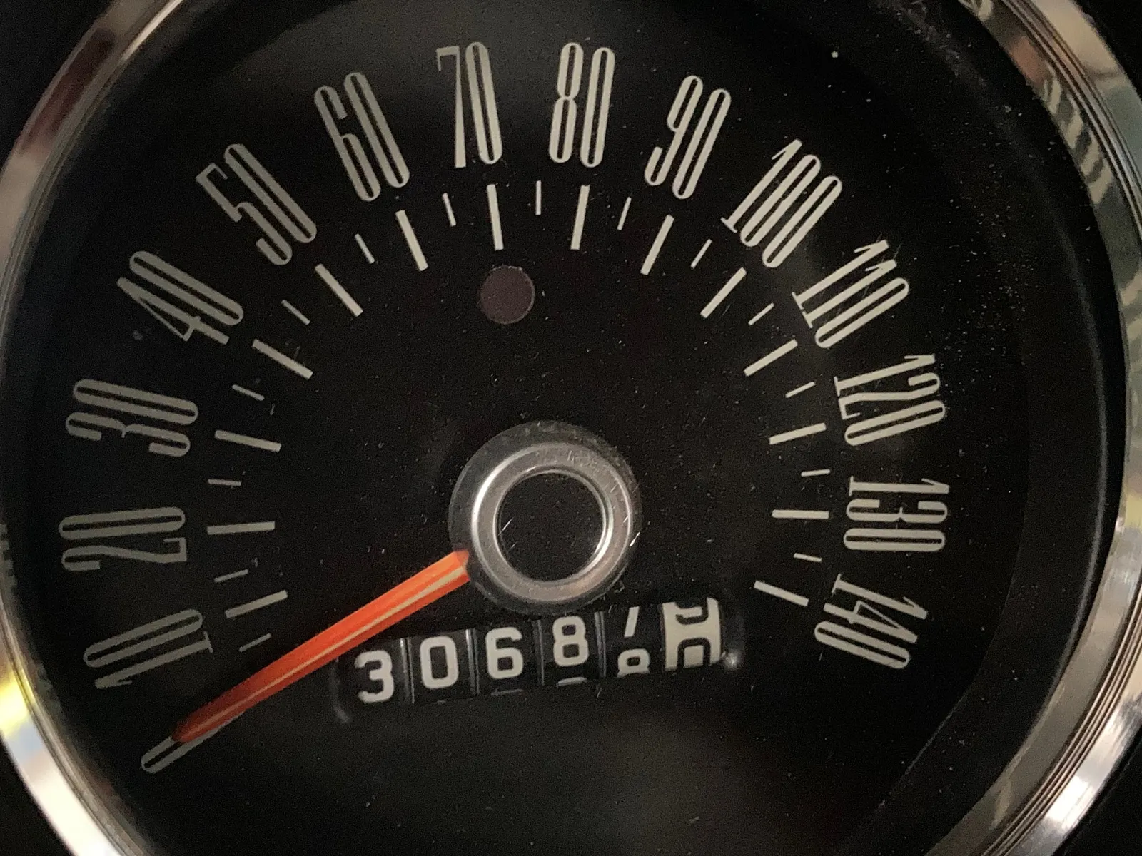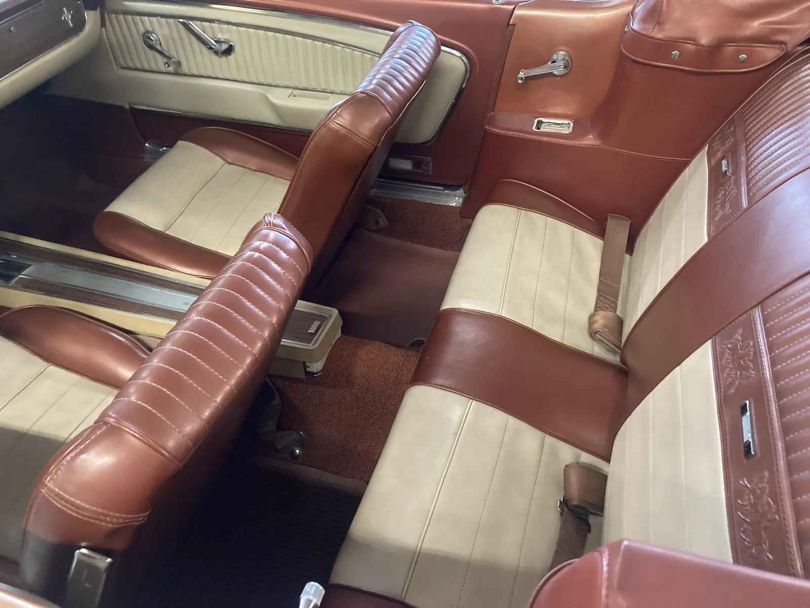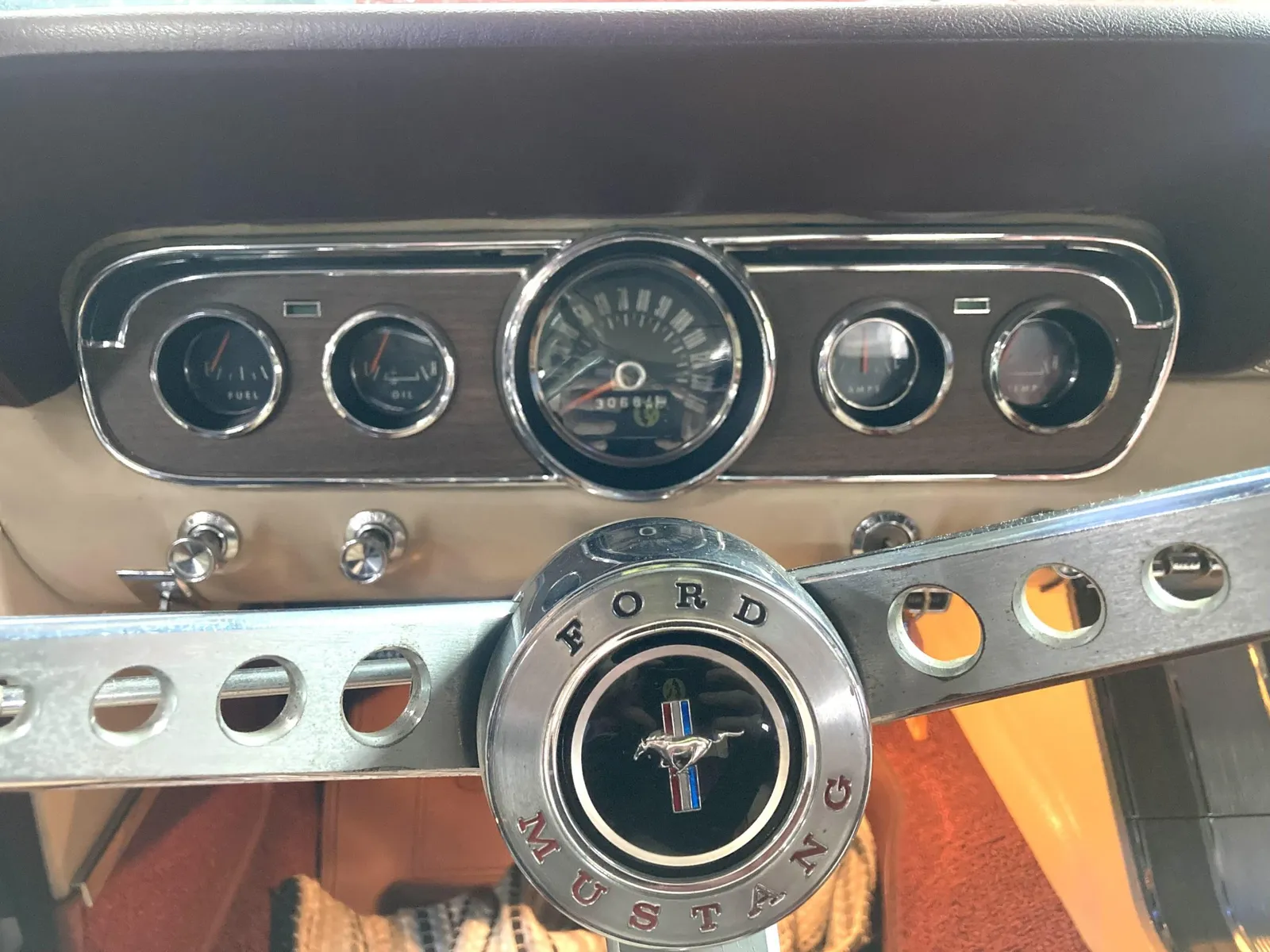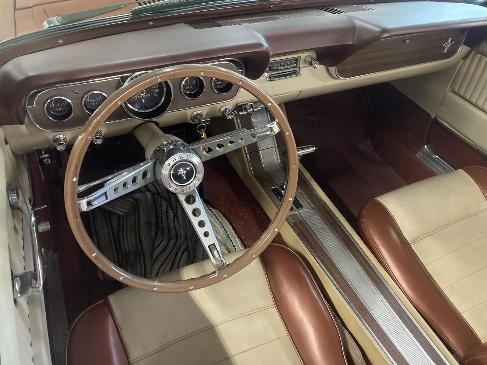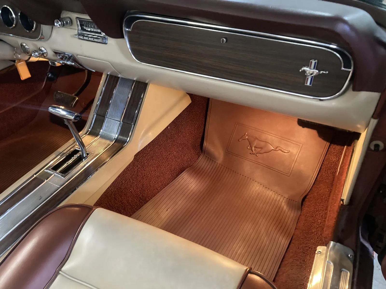Mustang convertible finished in Emberglo over Emberglo and Parchment vinyl with a black soft top, powered by a 289ci V8 and a C4 three-speed automatic.
