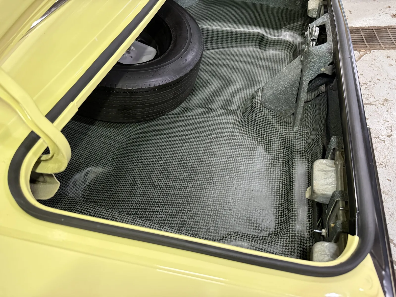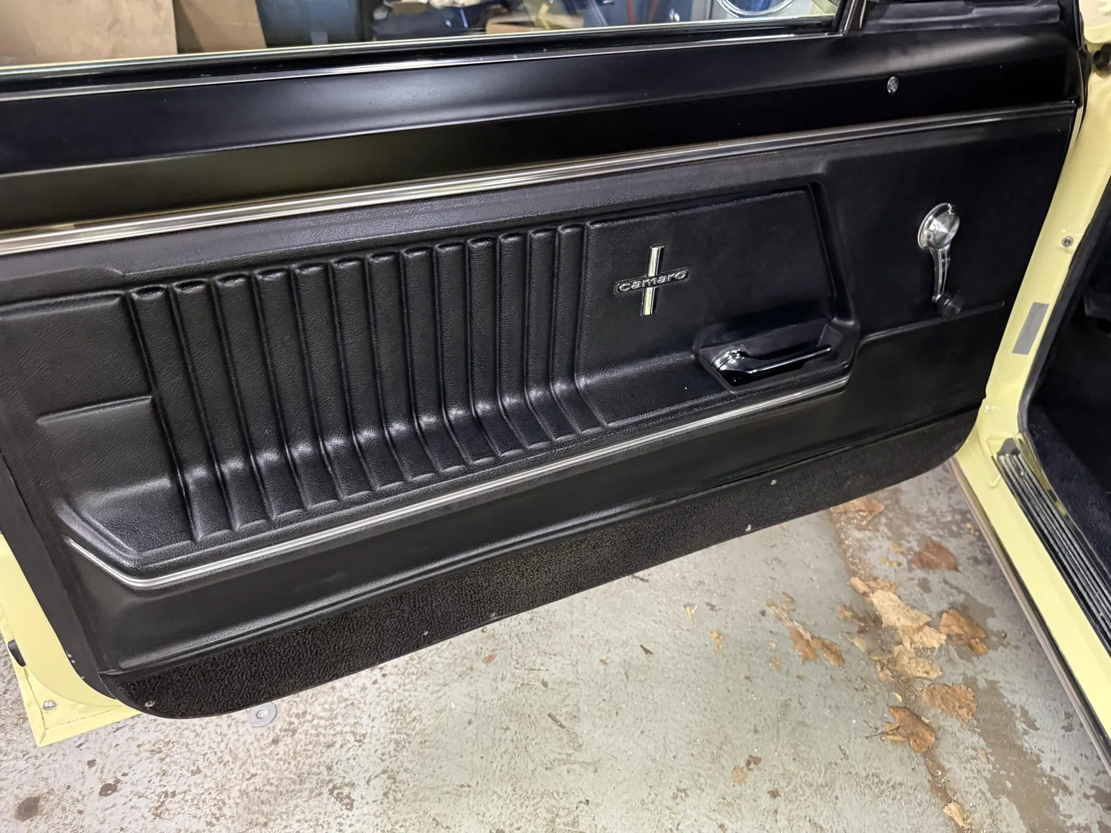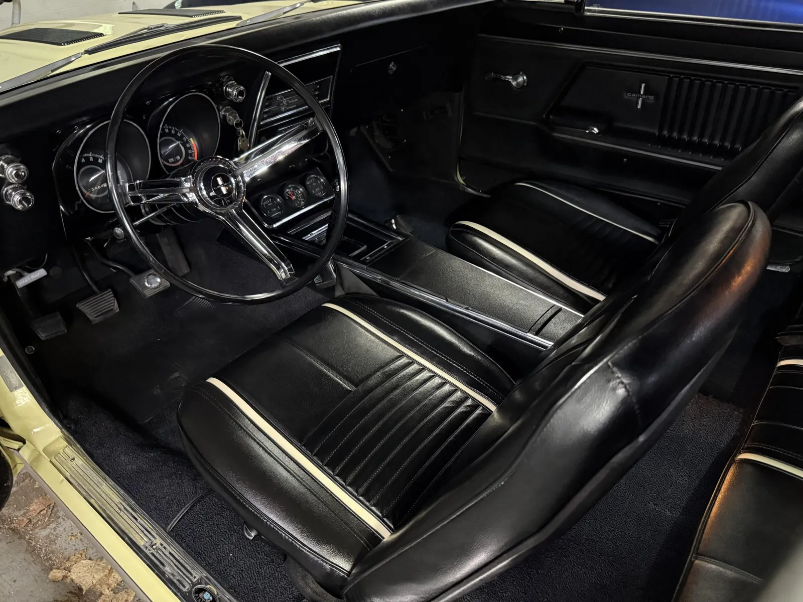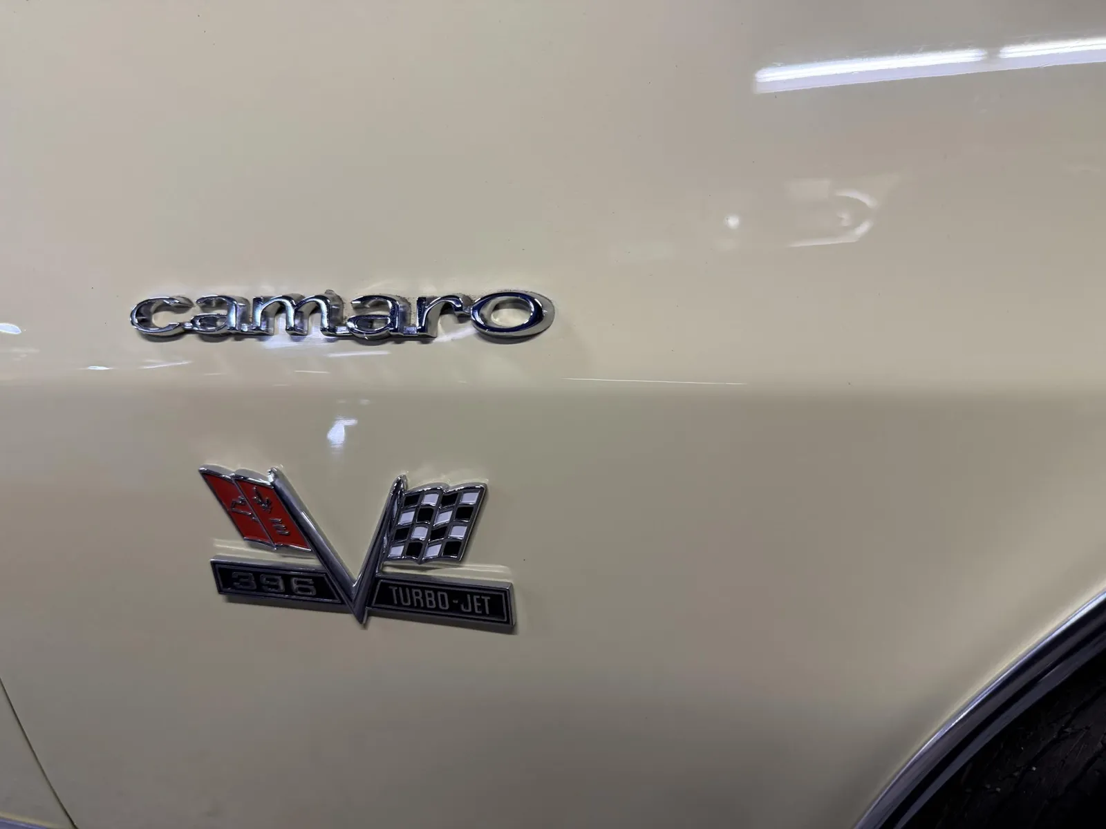 Camaro RS/SS coupe finished in Butternut Yellow with a black nose stripe and black vinyl top, powered by an L78 396ci V8 and a four-speed manual transmission.
