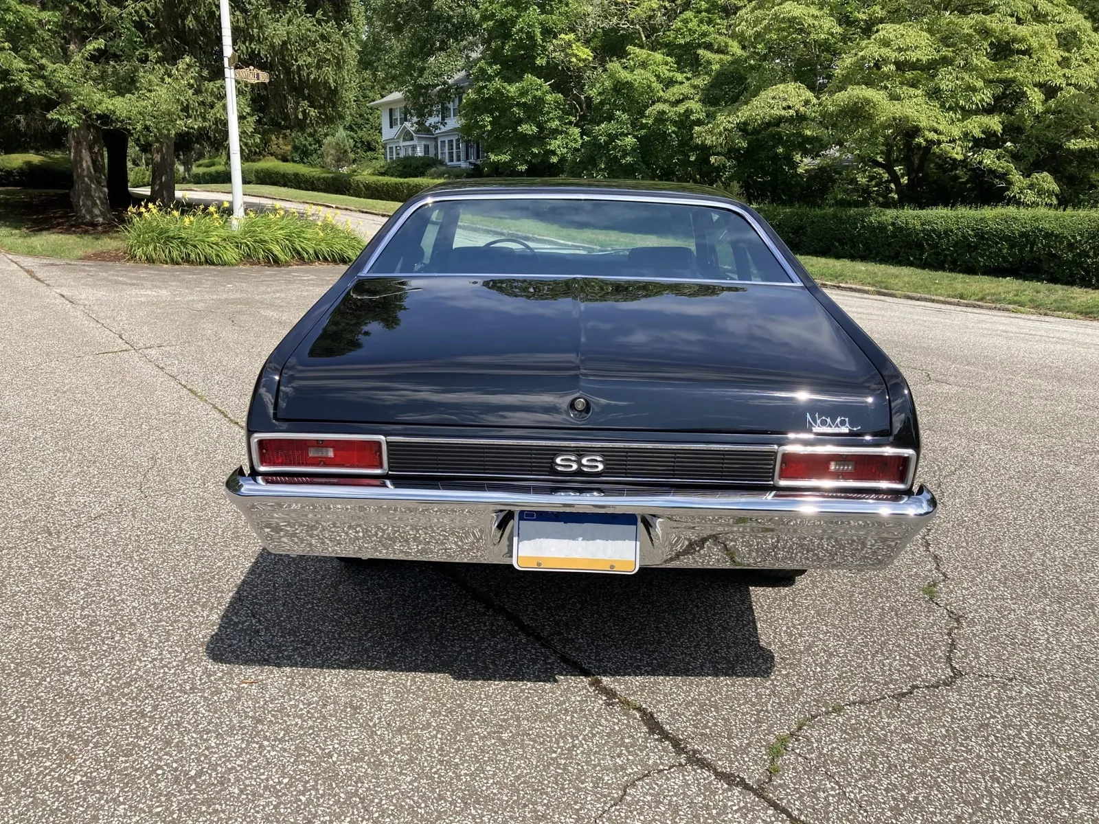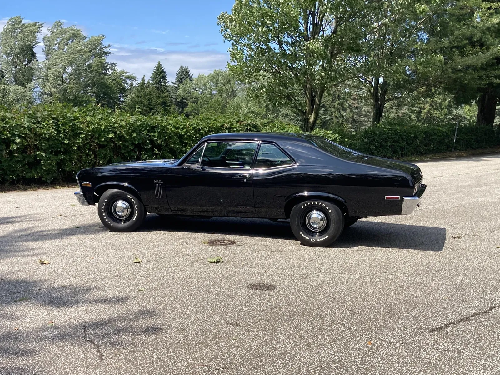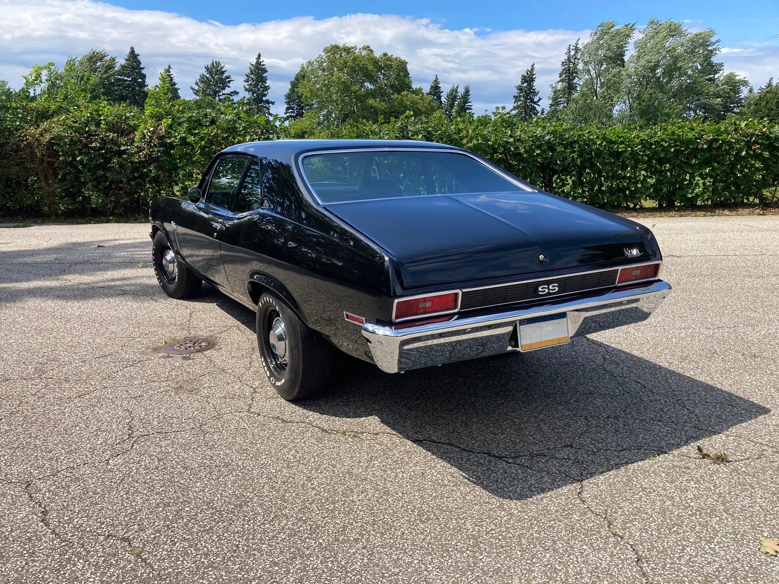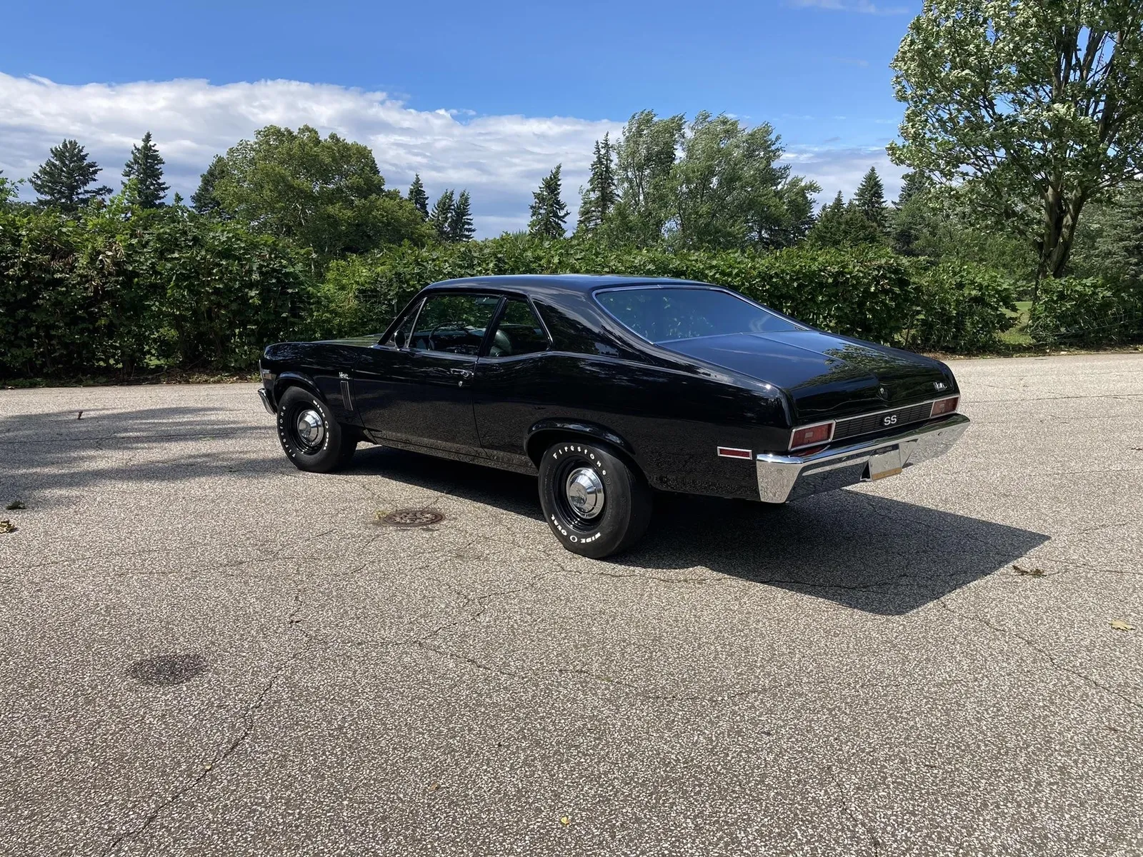 Nova SS finished in black over black vinyl, powered by a replacement 396ci V8 and a Muncie M21 close-ratio four-speed manual transmission.