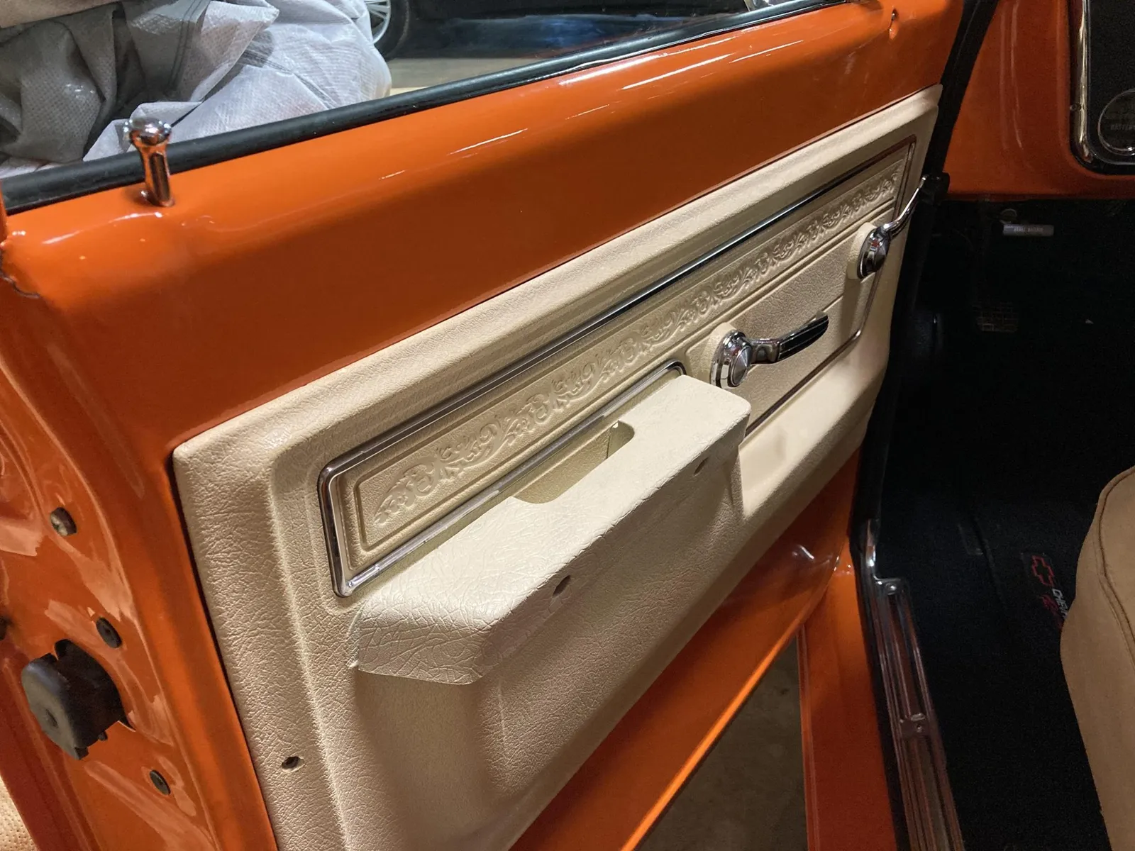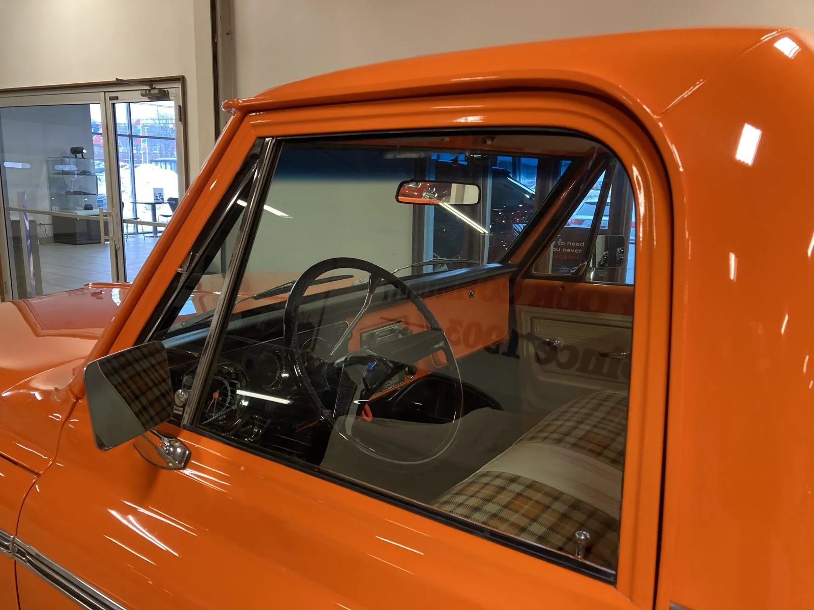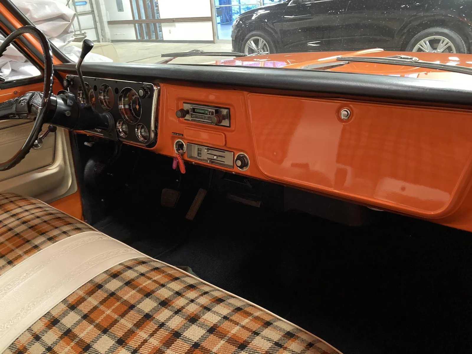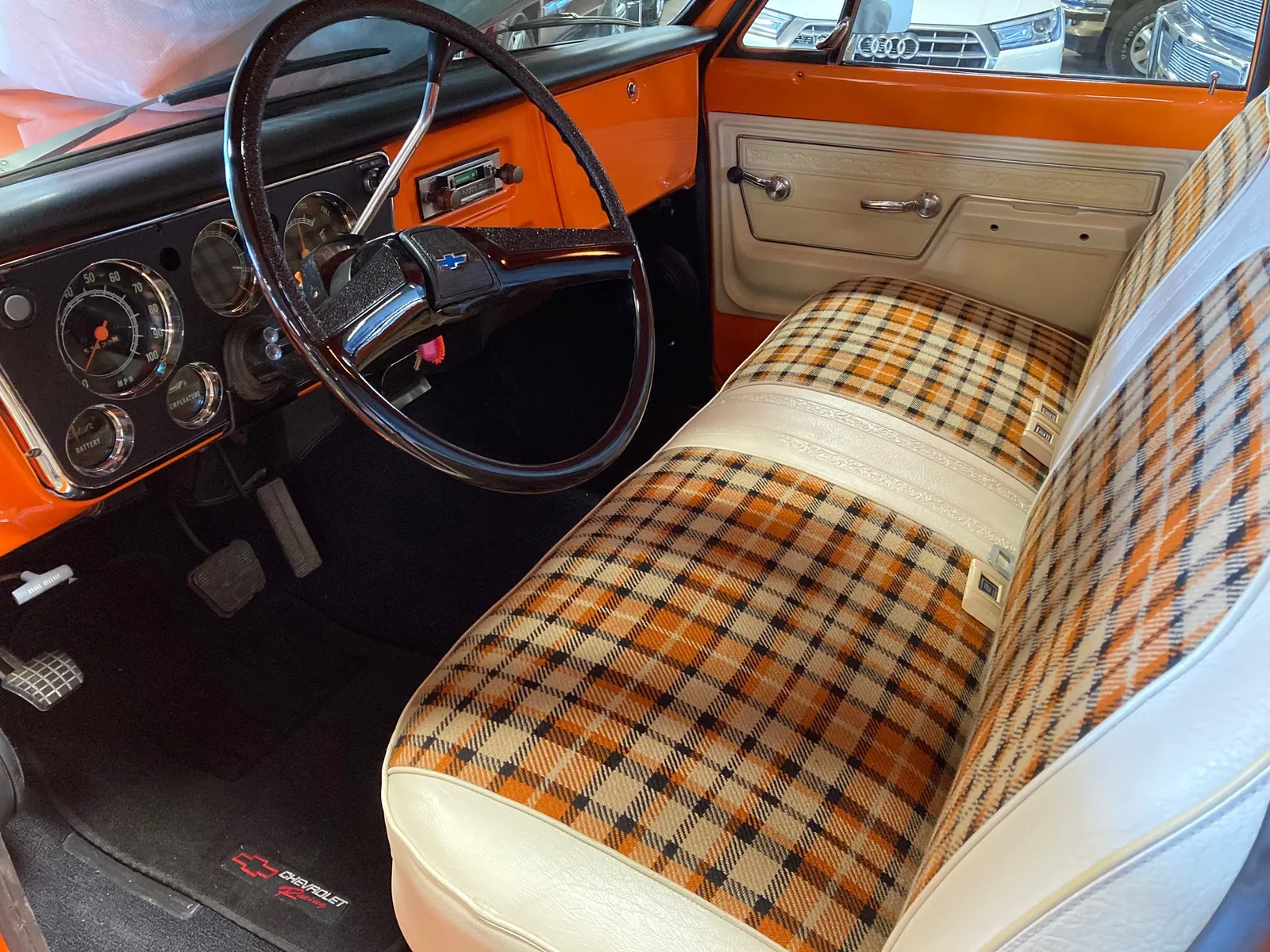 Short-bed standard-cab pickup finished in Omaha Orange over Parchment vinyl with orange plaid inserts, powered by a 350ci V8 with a three-speed automatic transmission.