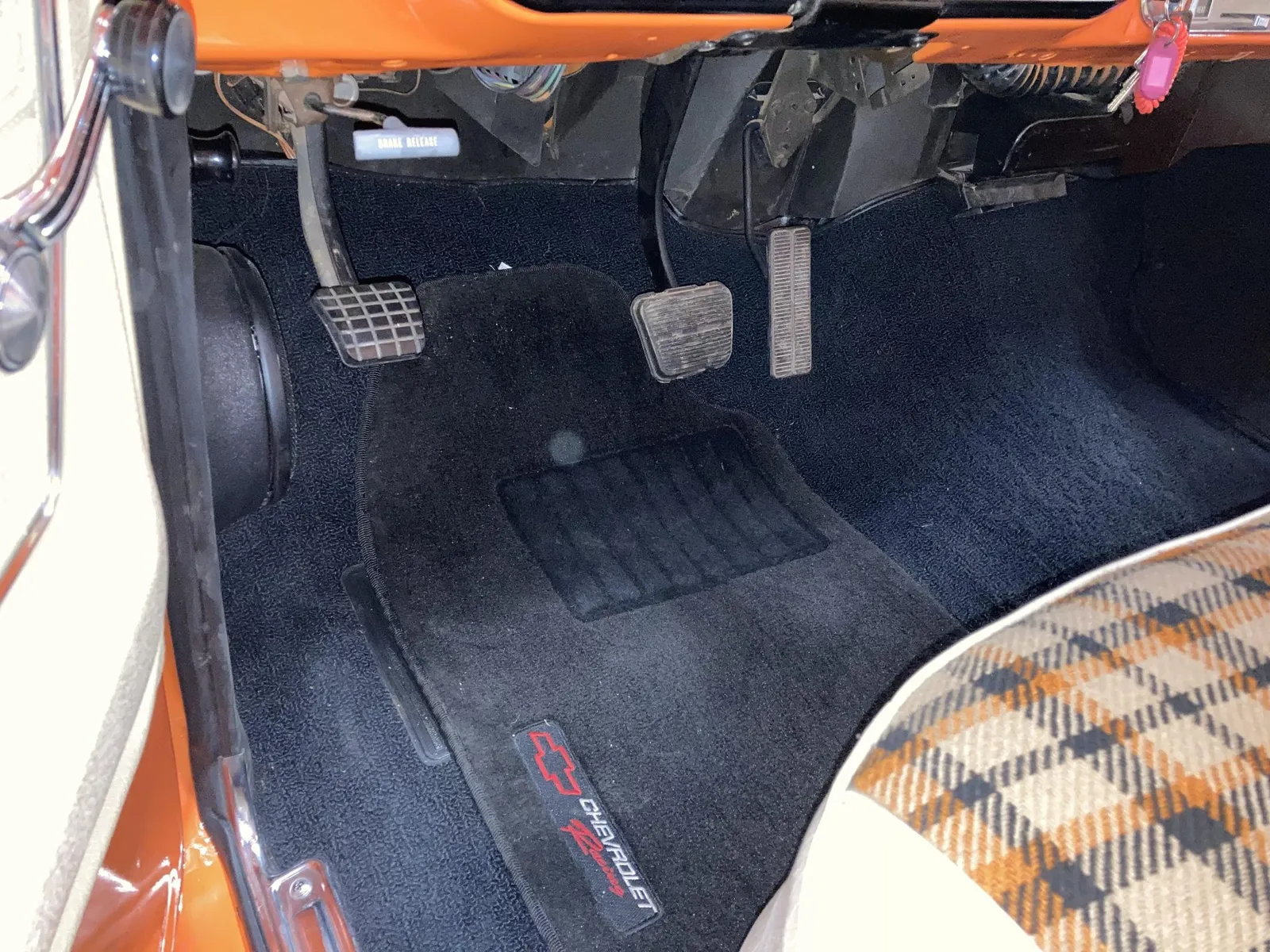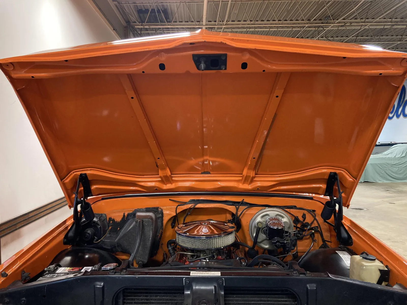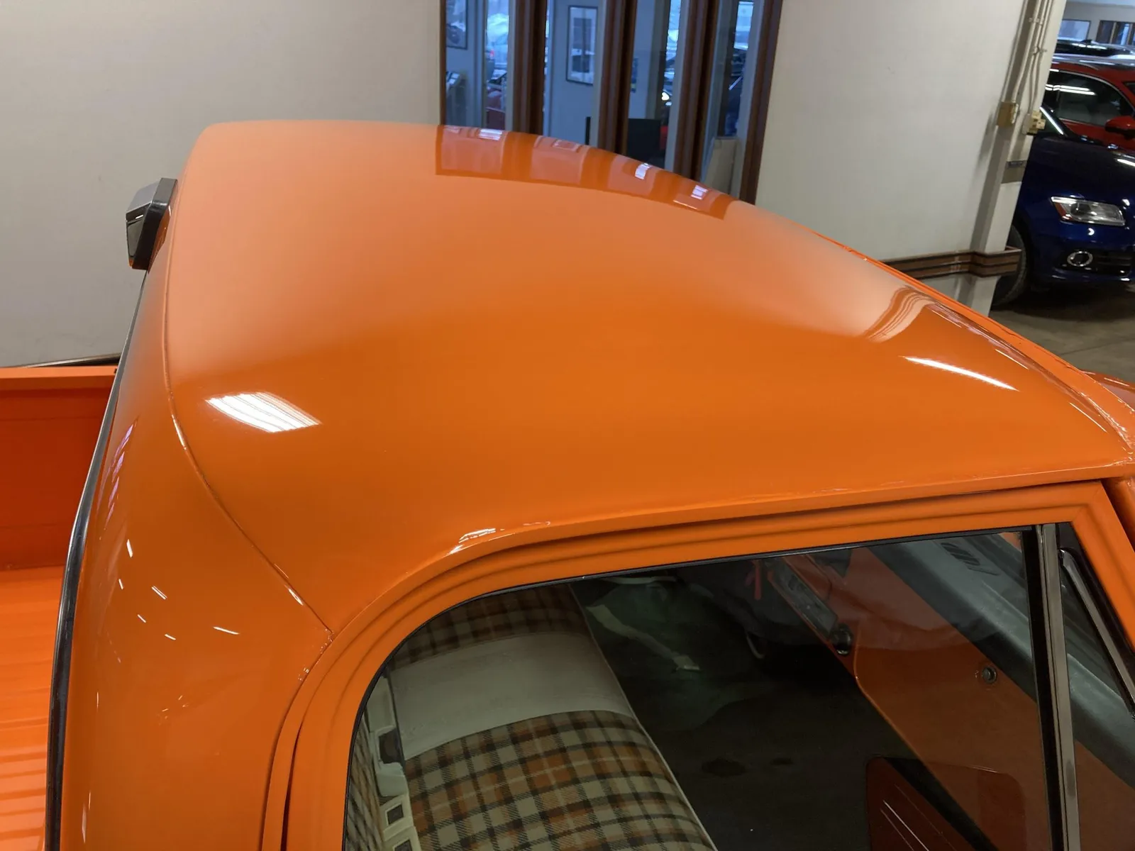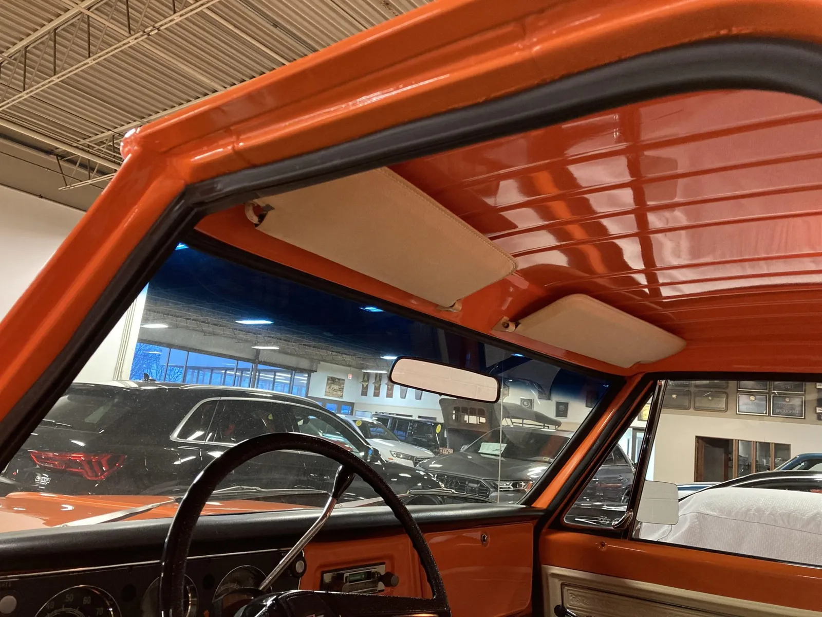 Short-bed standard-cab pickup finished in Omaha Orange over Parchment vinyl with orange plaid inserts, powered by a 350ci V8 with a three-speed automatic transmission.