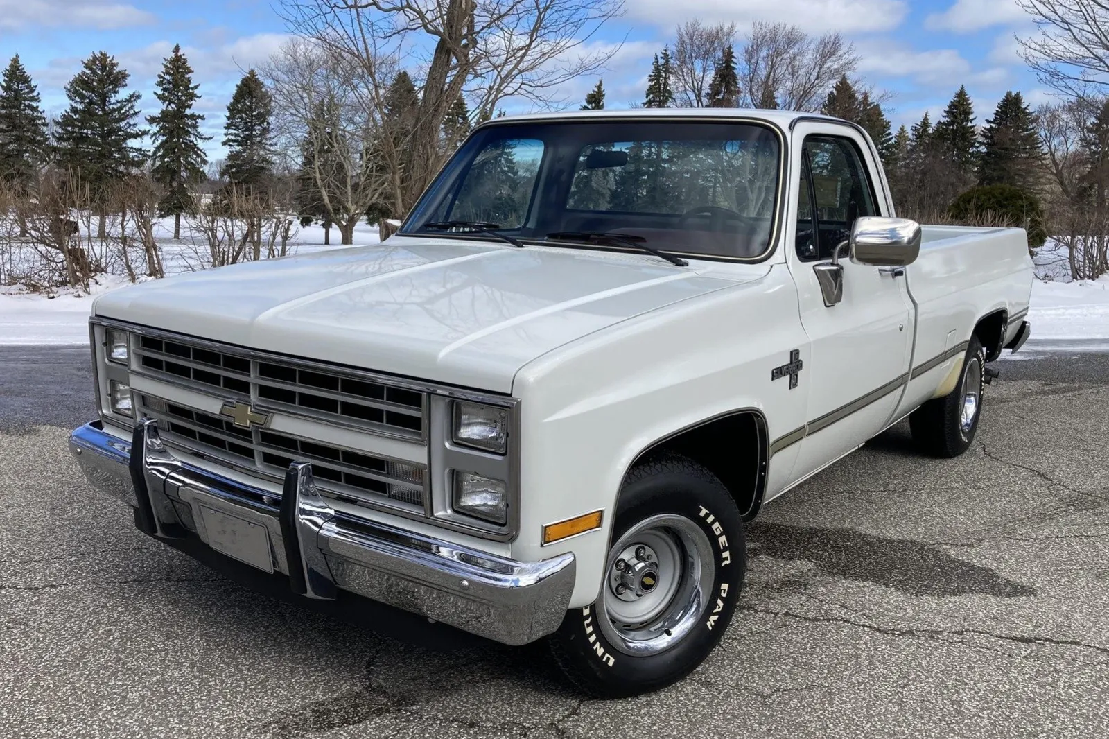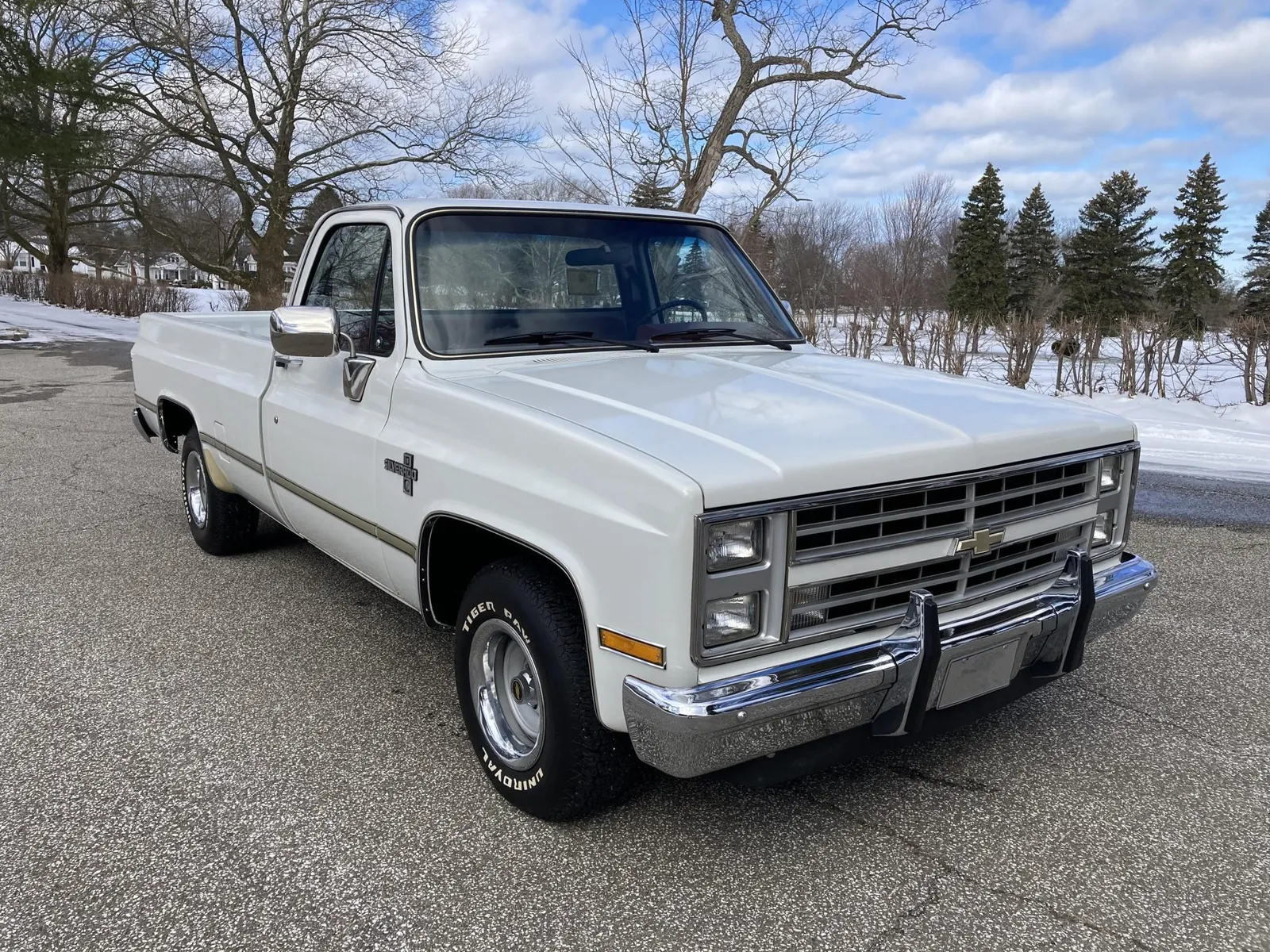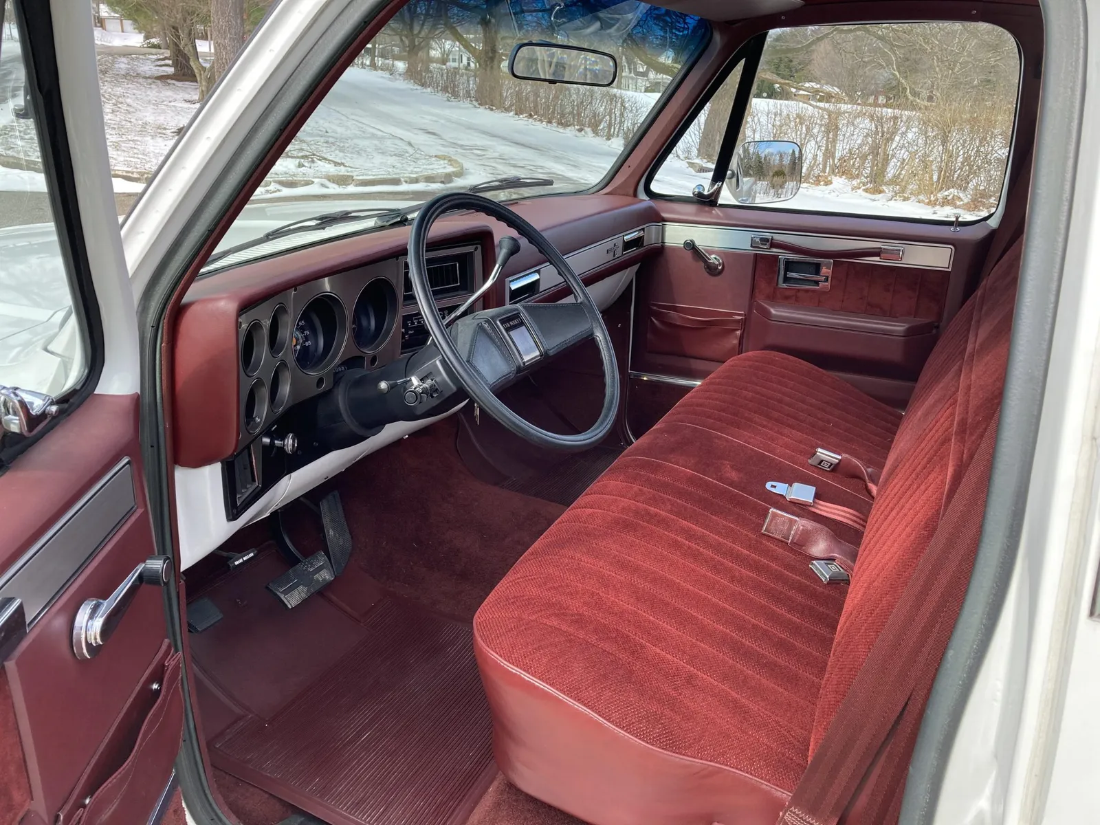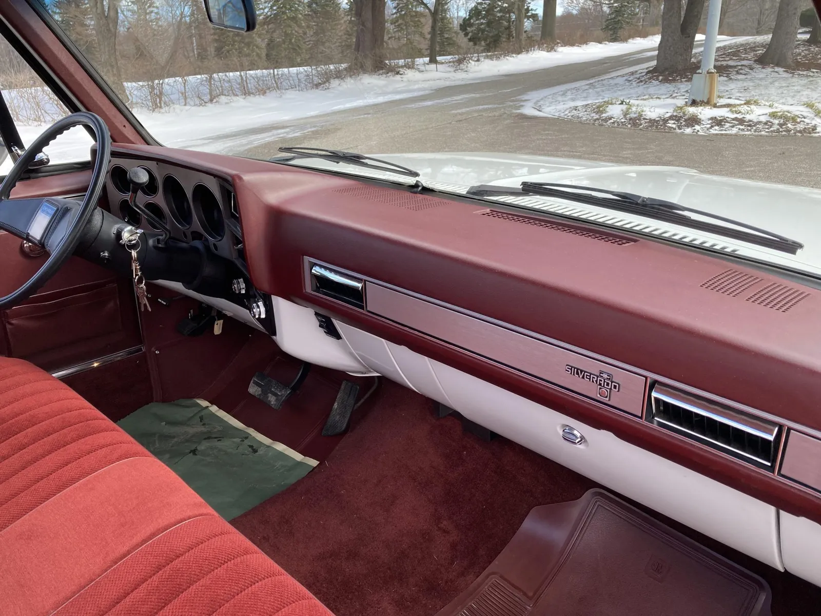 Chevrolet C10 Silverado pickup finished in white over red cloth upholstery and equipped with a 305ci V8 and a four-speed automatic transmission.