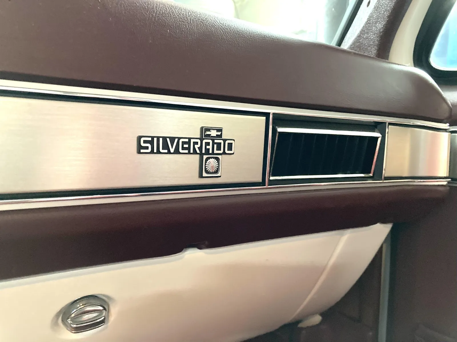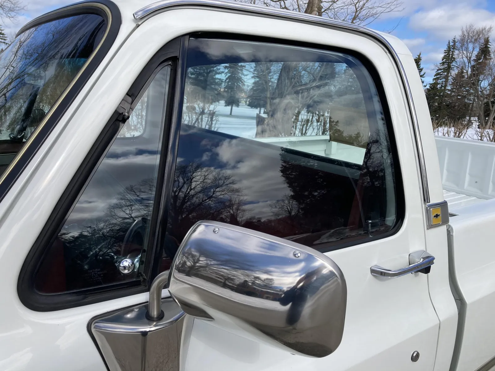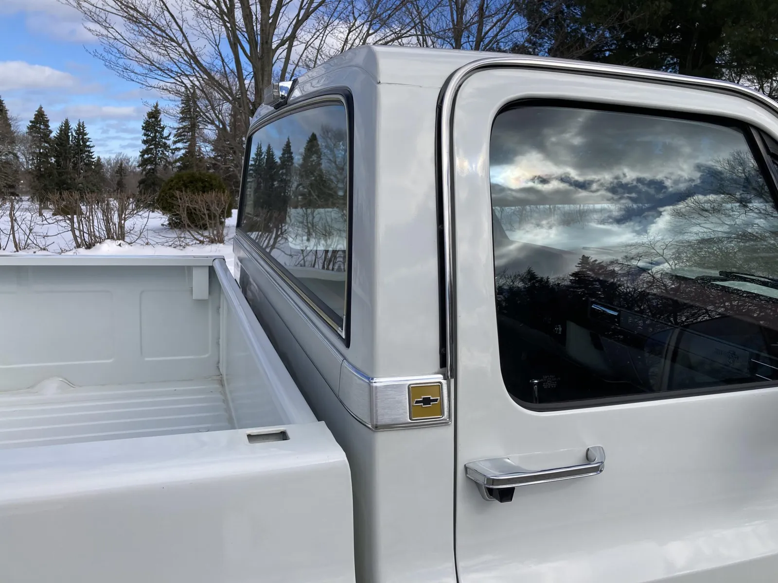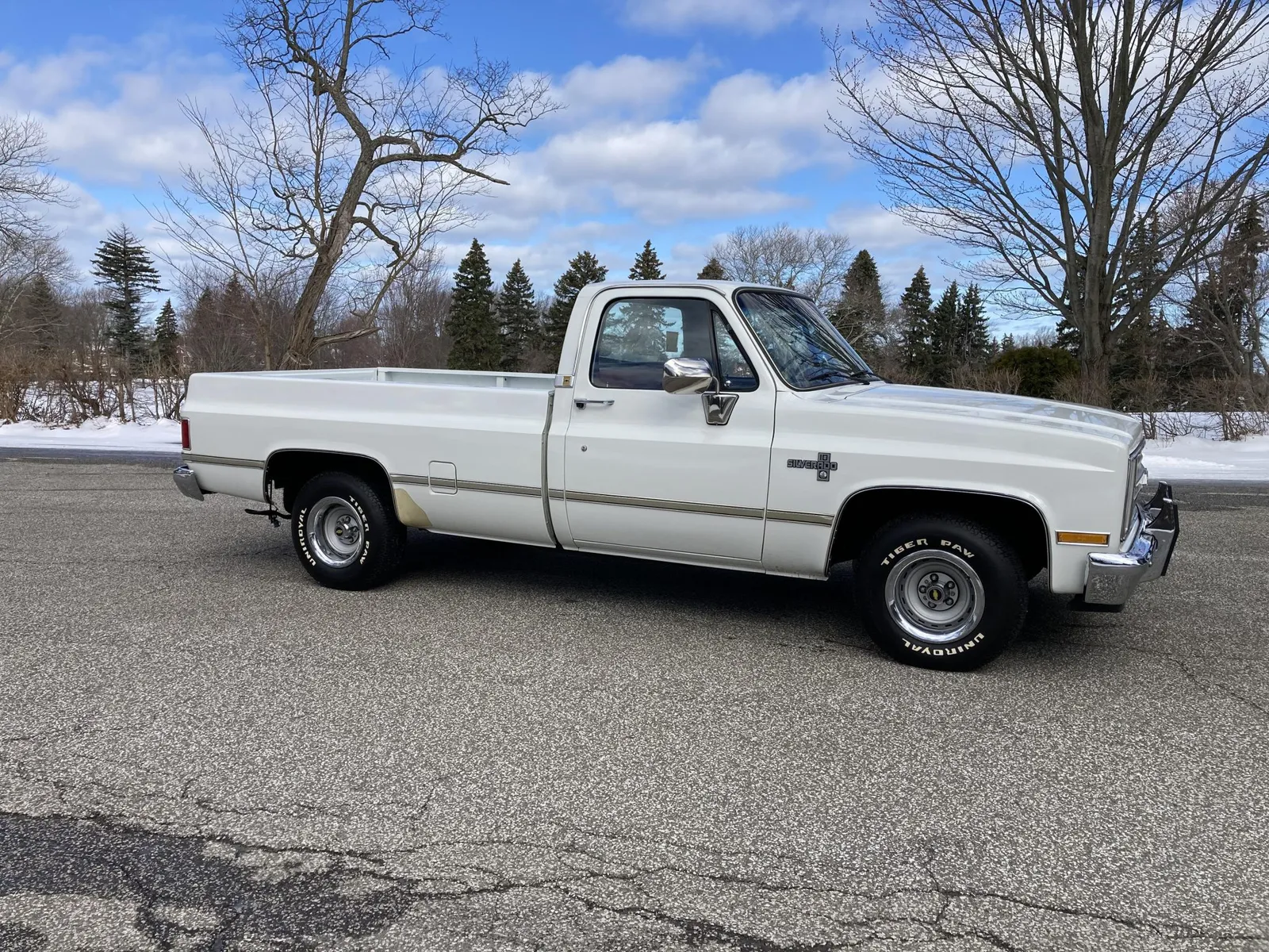 Chevrolet C10 Silverado pickup finished in white over red cloth upholstery and equipped with a 305ci V8 and a four-speed automatic transmission.