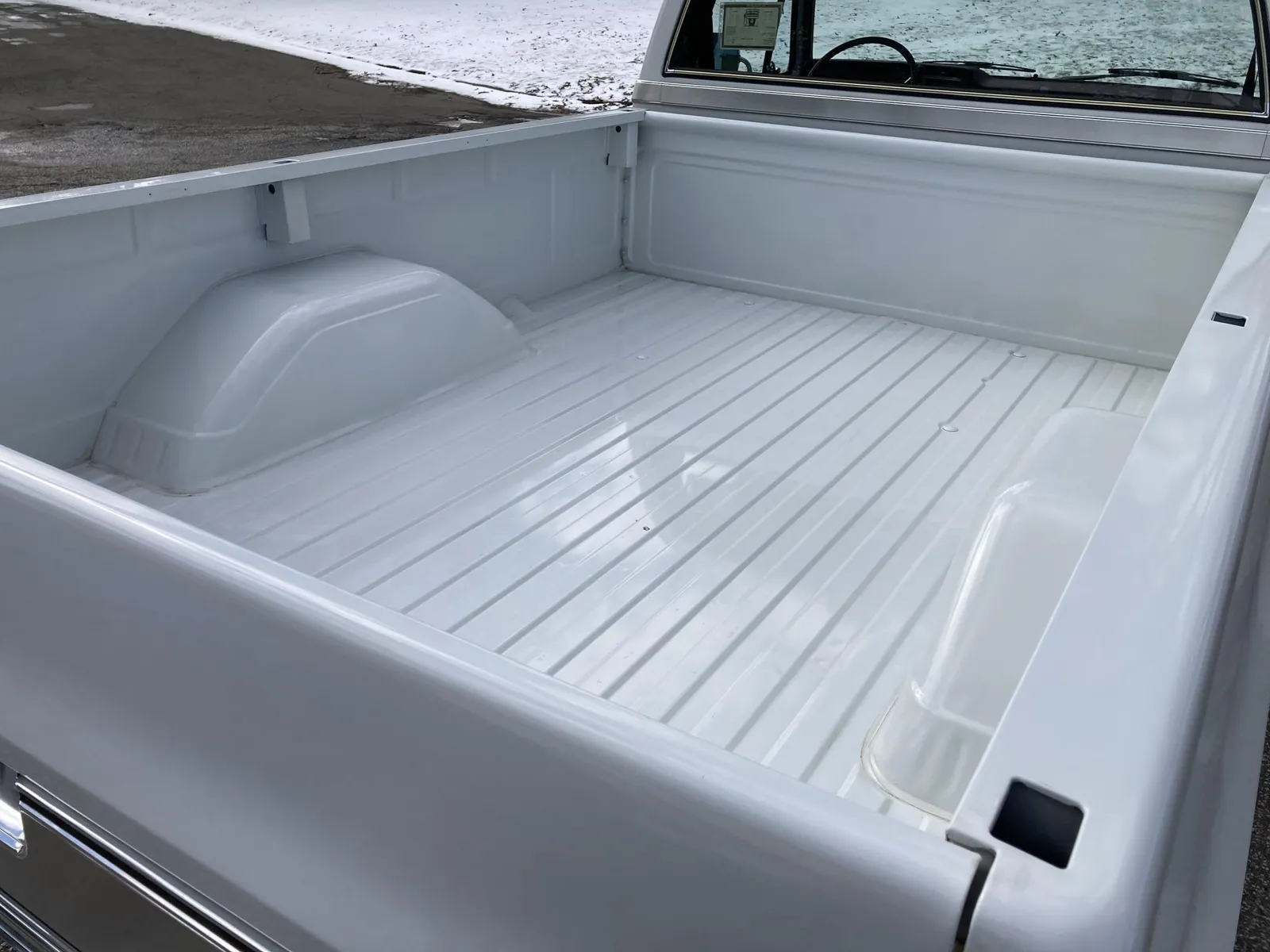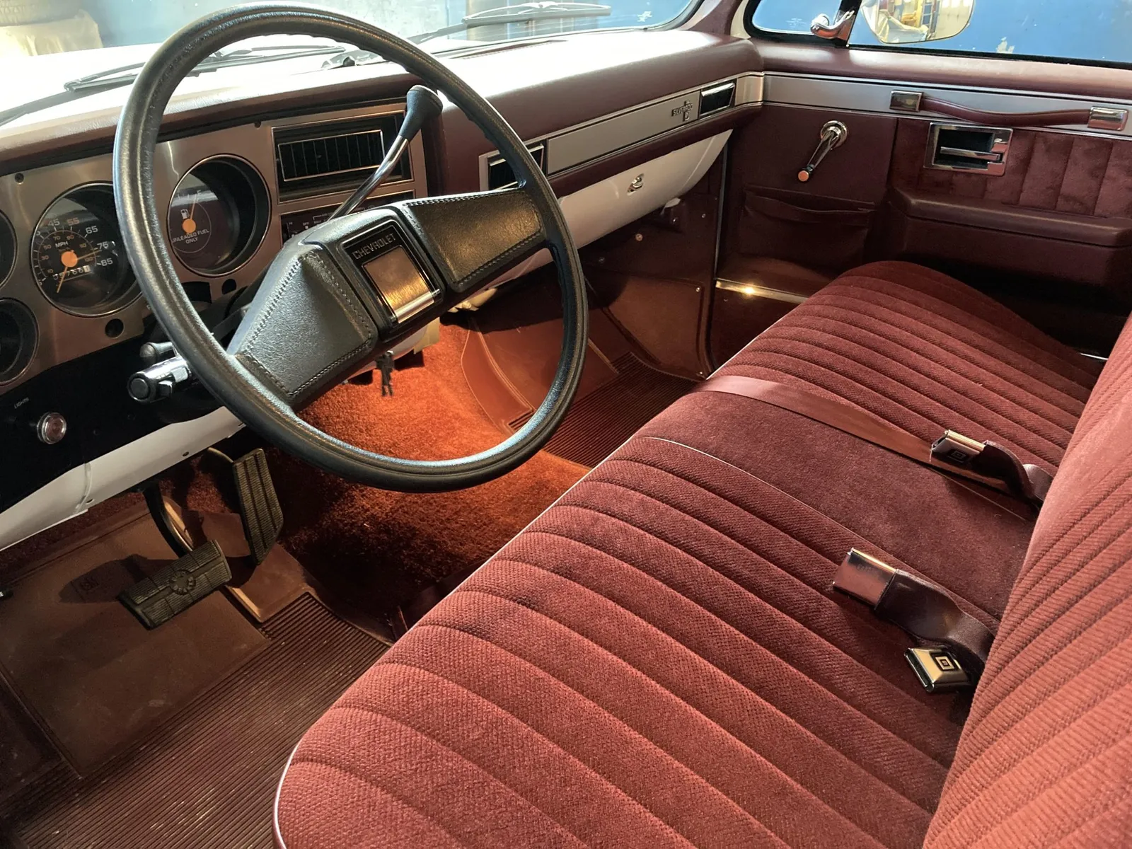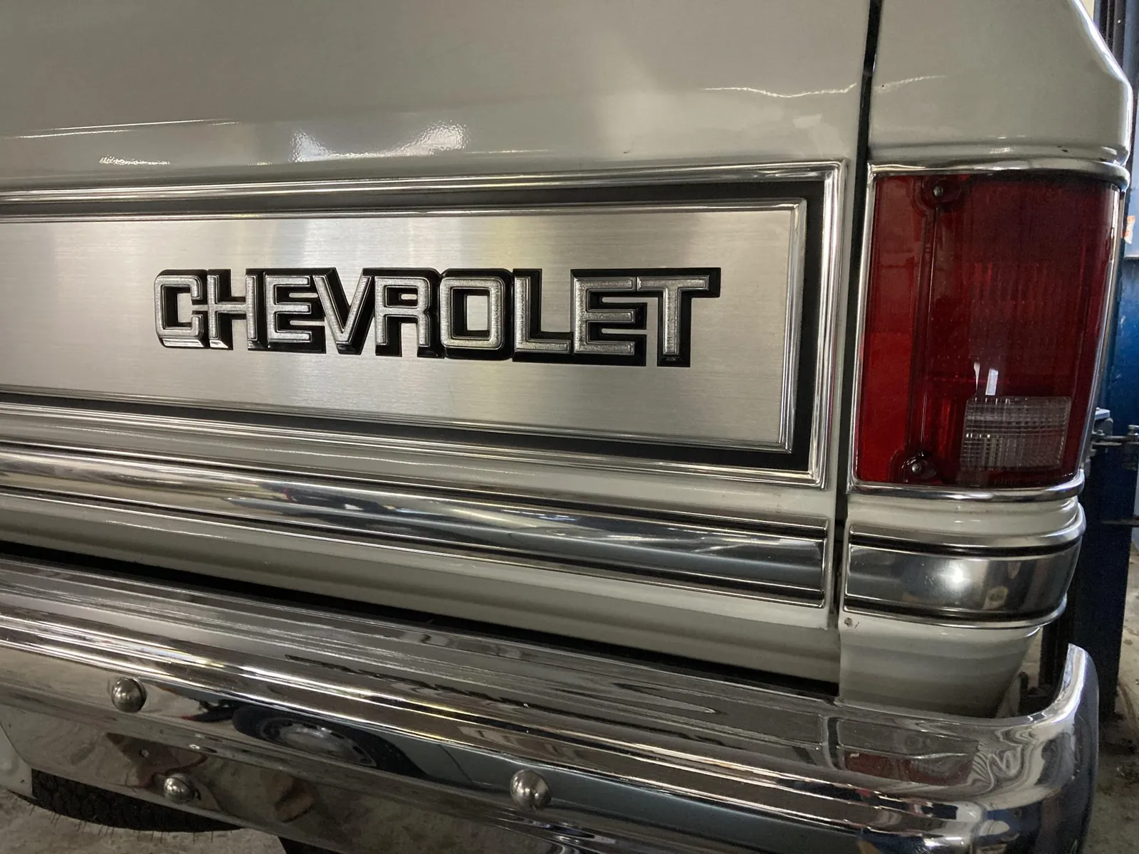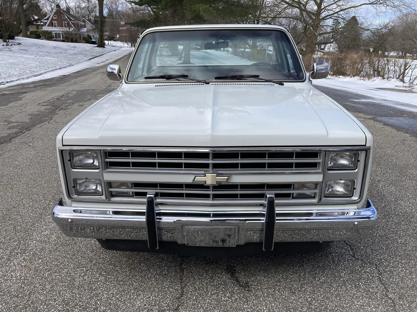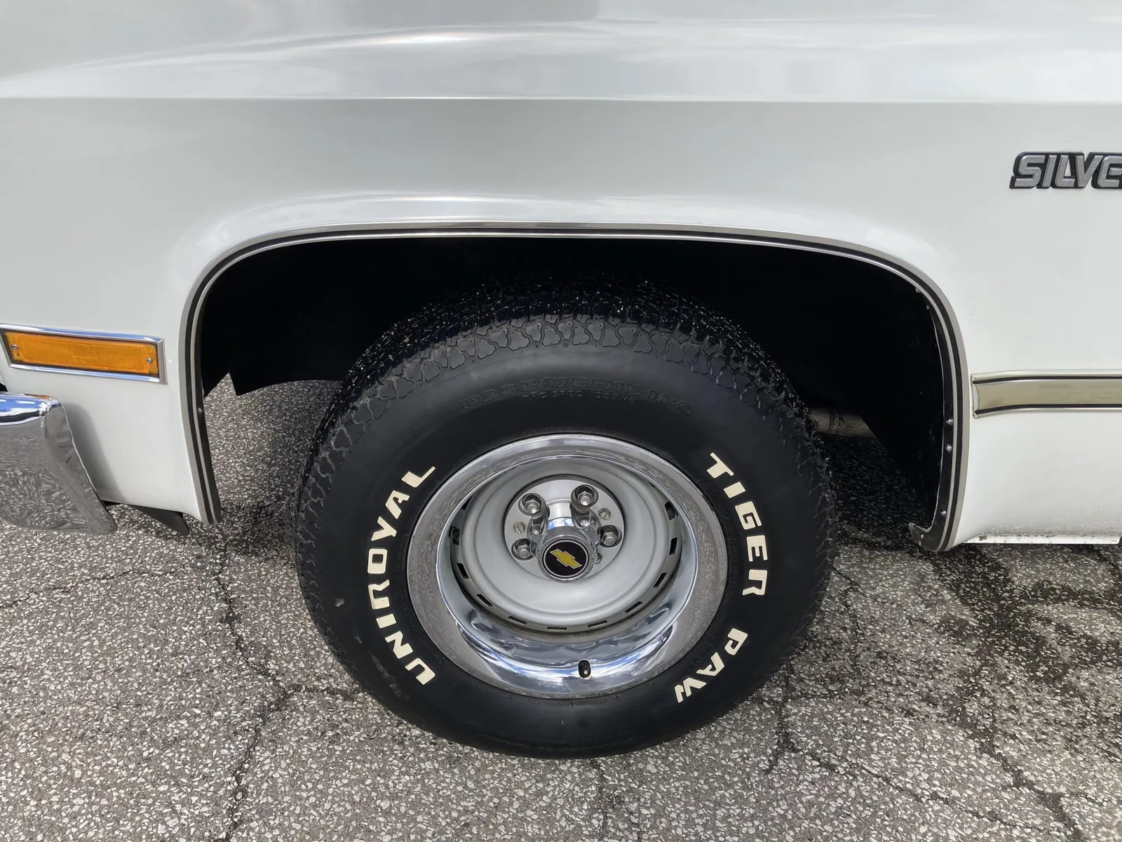Chevrolet C10 Silverado pickup finished in white over red cloth upholstery and equipped with a 305ci V8 and a four-speed automatic transmission.